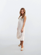 Елегантна сукня міді на бретелях з крепу з ґудзиками.