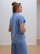 Короткий рукав та вільний крій забезпечують максимальний комфорт, а класичний комір і лаконічна фурнітура роблять модель універсальною — вона легко поєднується як із джинсами чи шортами, так і зі спідницями або лляними брюками. Ідеальний варіант як для міських буднів, так і для відпустки.