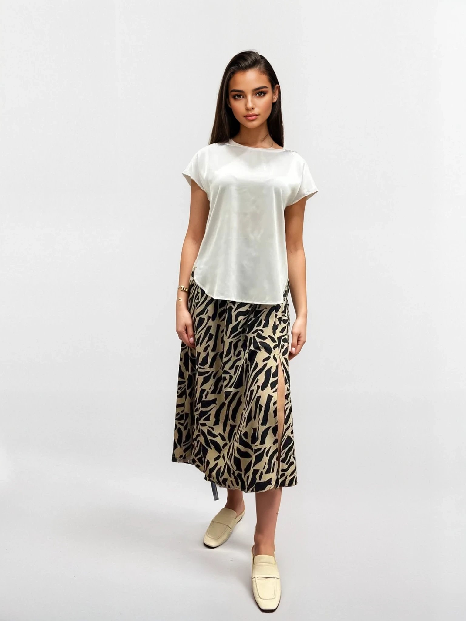 Спідниця на резинці з софту Легка та комфортна спідниця довжини міді стане універсальним елементом у вашому гардеробі. Матеріал: софт — м’яка, приємна до тіла тканина з легким струмливим ефектом. Добре тримає форму й не мнеться. Посадка: середня, на зручній еластичній резинці, що не перетискає та адаптується до фігури. Особливості: М’яка хвиляста фактура завдяки крою й тканині. Вільний крій забезпечує легкість руху. Дизайн: Мінімалістичний стиль, який легко доповнити будь-яким верхом — від базових футболок до сорочок або топів. Актуальна довжина міді — трендовий та зручний варіант на щодень чи вихід. Ідеальний вибір для літнього сезону, роботи чи прогулянки.