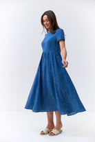 Короткі рукави та округла горловина гармонійно доповнюють дизайн, а дрібний білий принт у крапочку на насиченому синьому фоні додає сукні романтичного шарму.