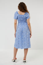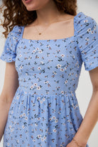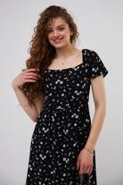 Сукня має приталений ліф зі збіркою "смок" (жатка), що забезпечує ідеальну посадку по фігурі та комфорт. Квадратний виріз горловини додає образу витонченості. Короткі рукави-ліхтарики злегка об'ємні, що є модним акцентом.