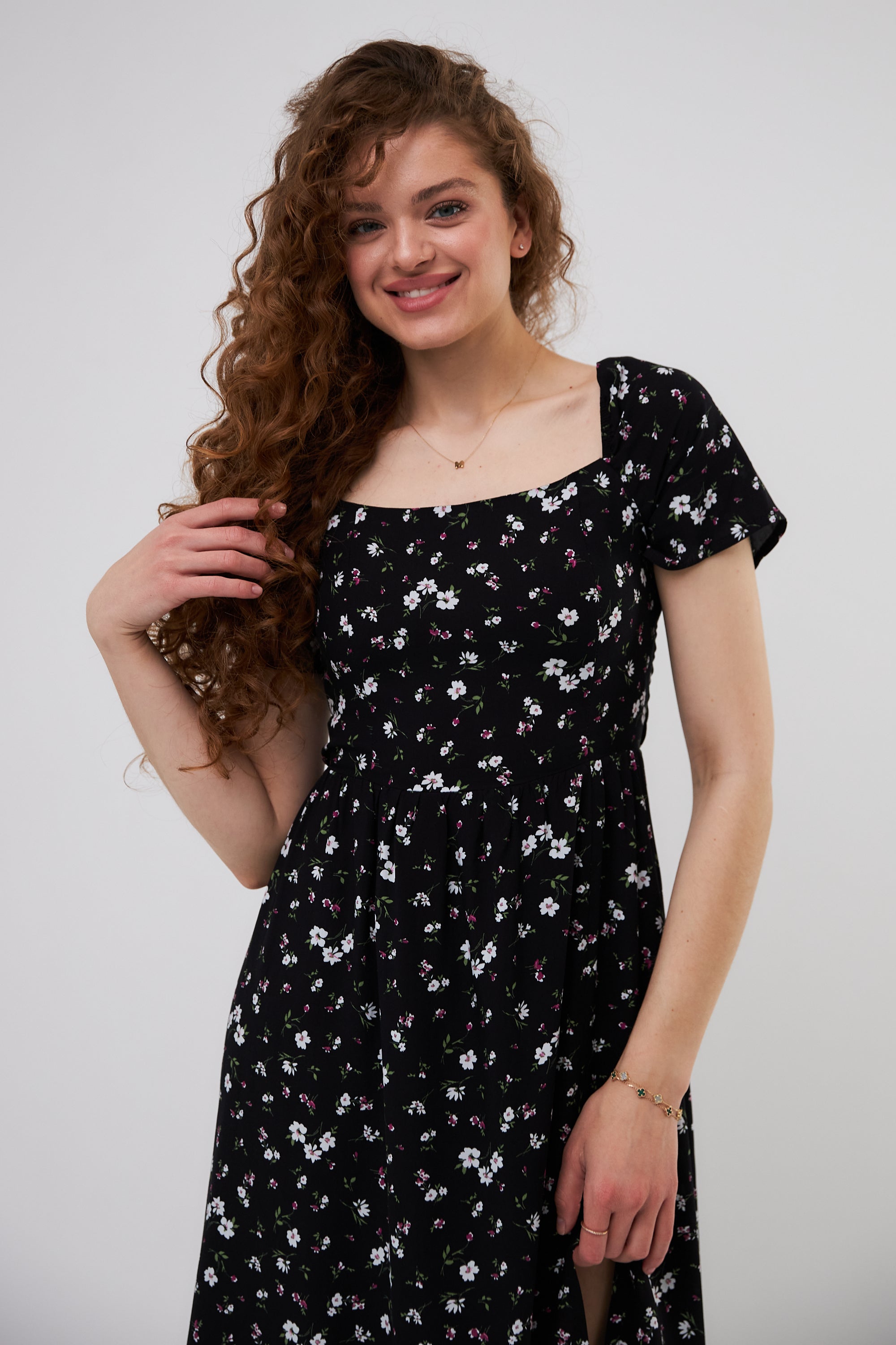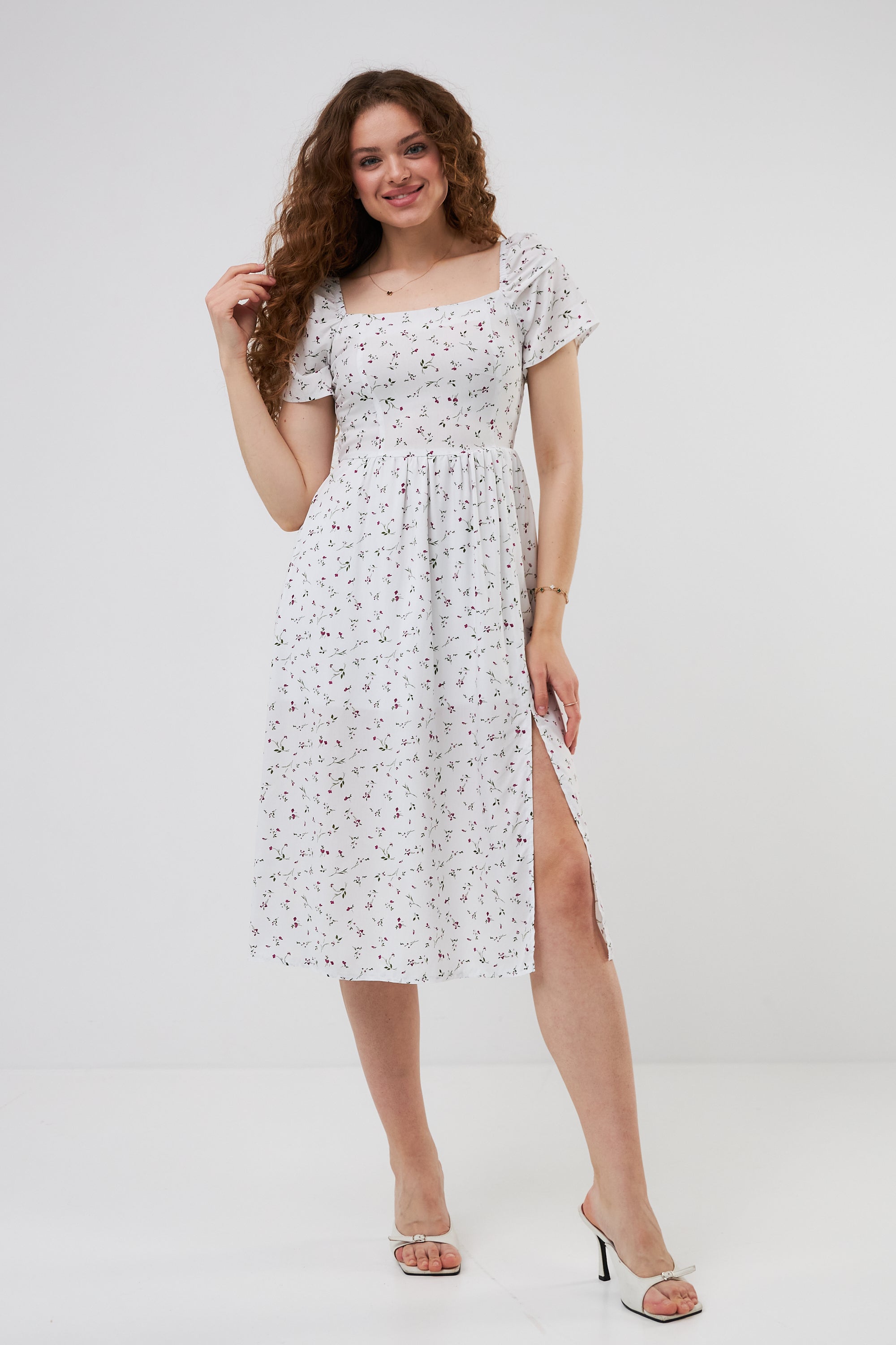 Елегантна та легка жіноча сукня міді, яка ідеально підійде для літнього сезону. Виконана з приємної тканини з дрібним квітковим принтом на світлому фоні, вона створює ніжний та романтичний образ.