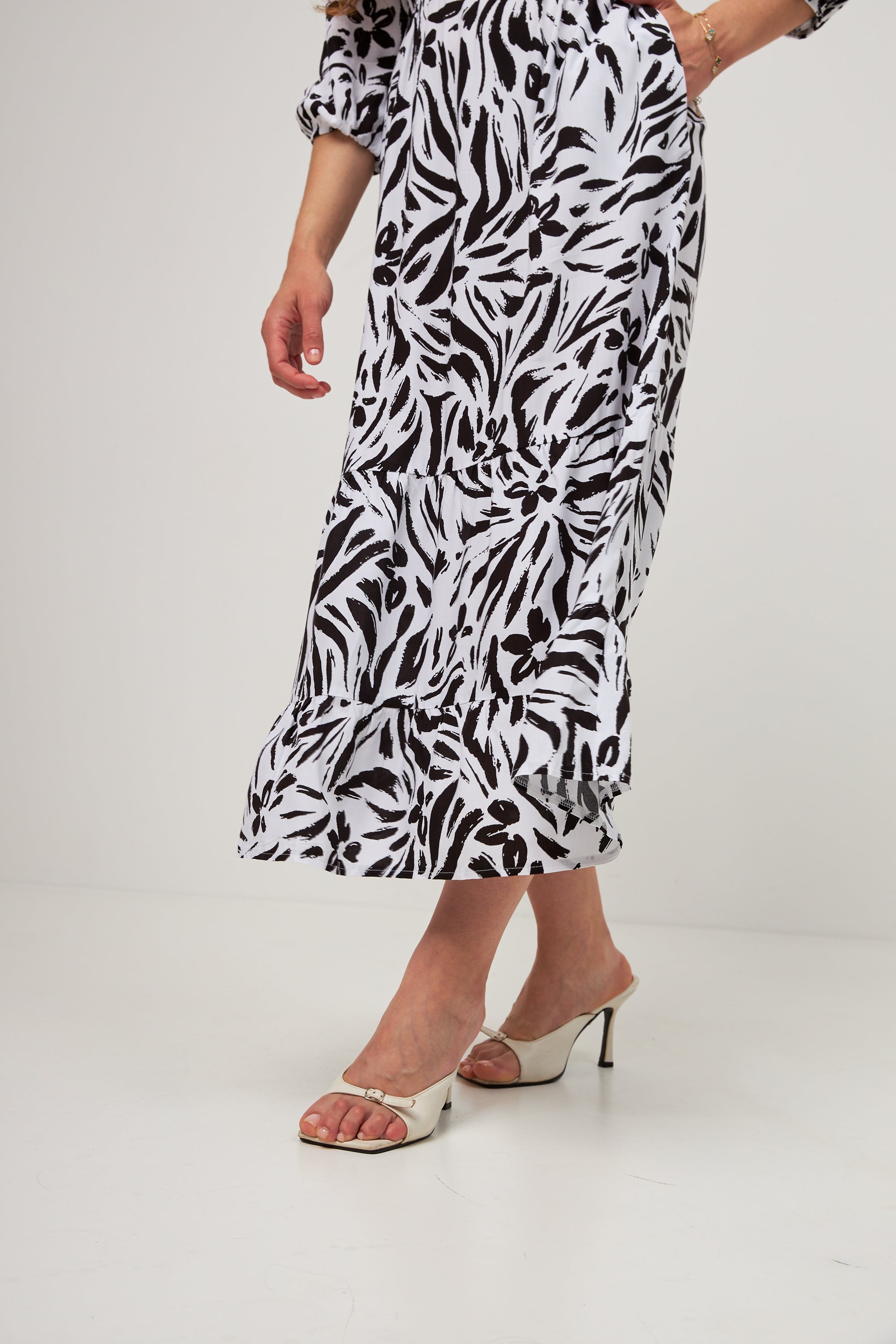 -Триярусний крій: Сукня має модний багатоярусний поділ, який створює ефектний об'єм і надає силуету легкості та динамічності. Кожен ярус делікатно спадає, додаючи образу романтичності та грайливості.