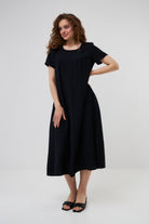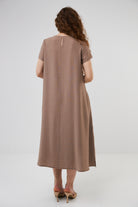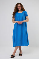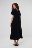 Сукня має вільний трапецієподібний крій, який забезпечує максимальний комфорт та свободу рухів, приховуючи можливі недоліки фігури. Круглий виріз горловини та короткі, вільні рукави додають моделі лаконічності та дозволяють шкірі дихати.