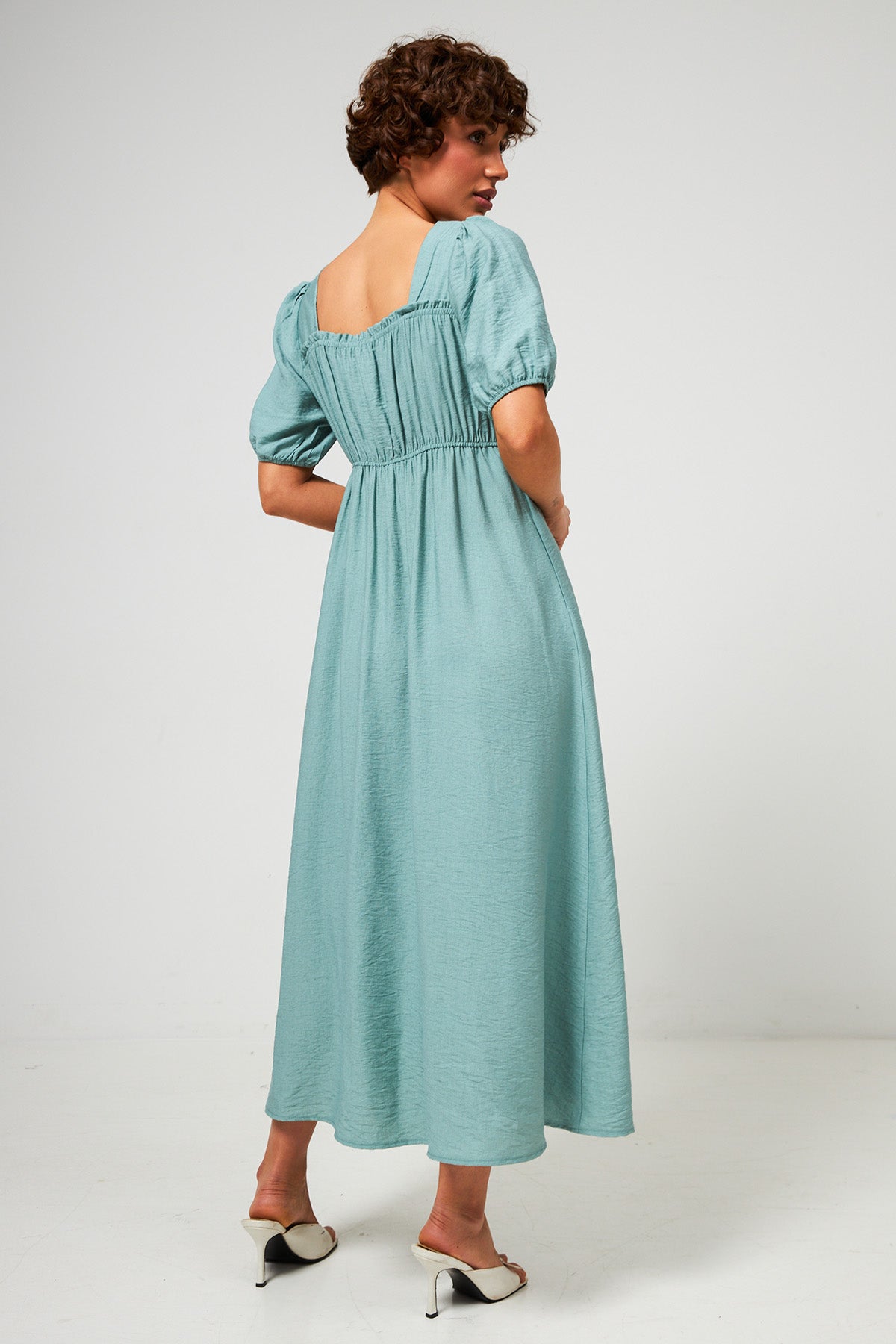 Приталений ліф з квадратним вирізом та делікатним рюшем акцентує увагу на зоні декольте, а вільна спідниця довжини максі додає образу жіночності.