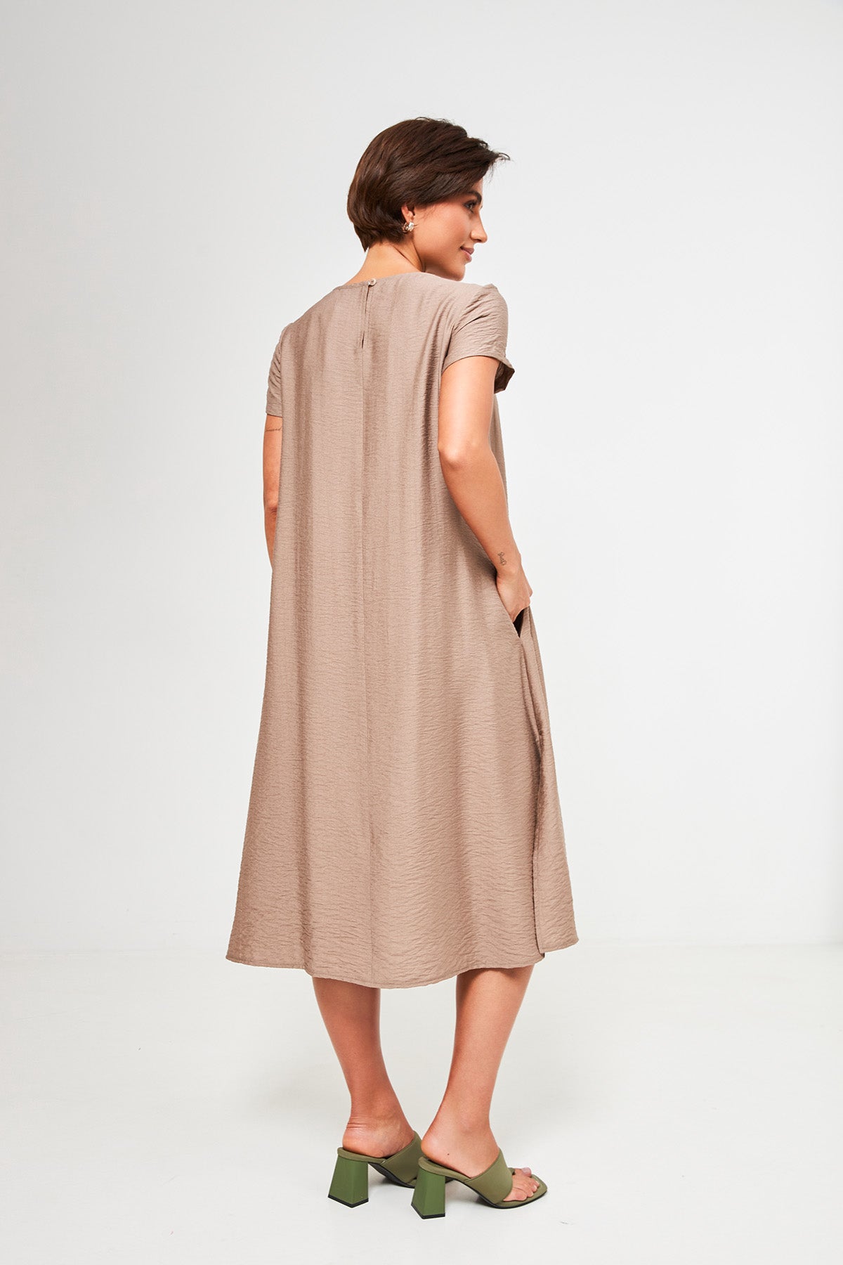 Трапецієподібний крій дарує повну свободу рухів і м’яко нівелює нюанси фігури, створюючи легкий, повітряний образ.