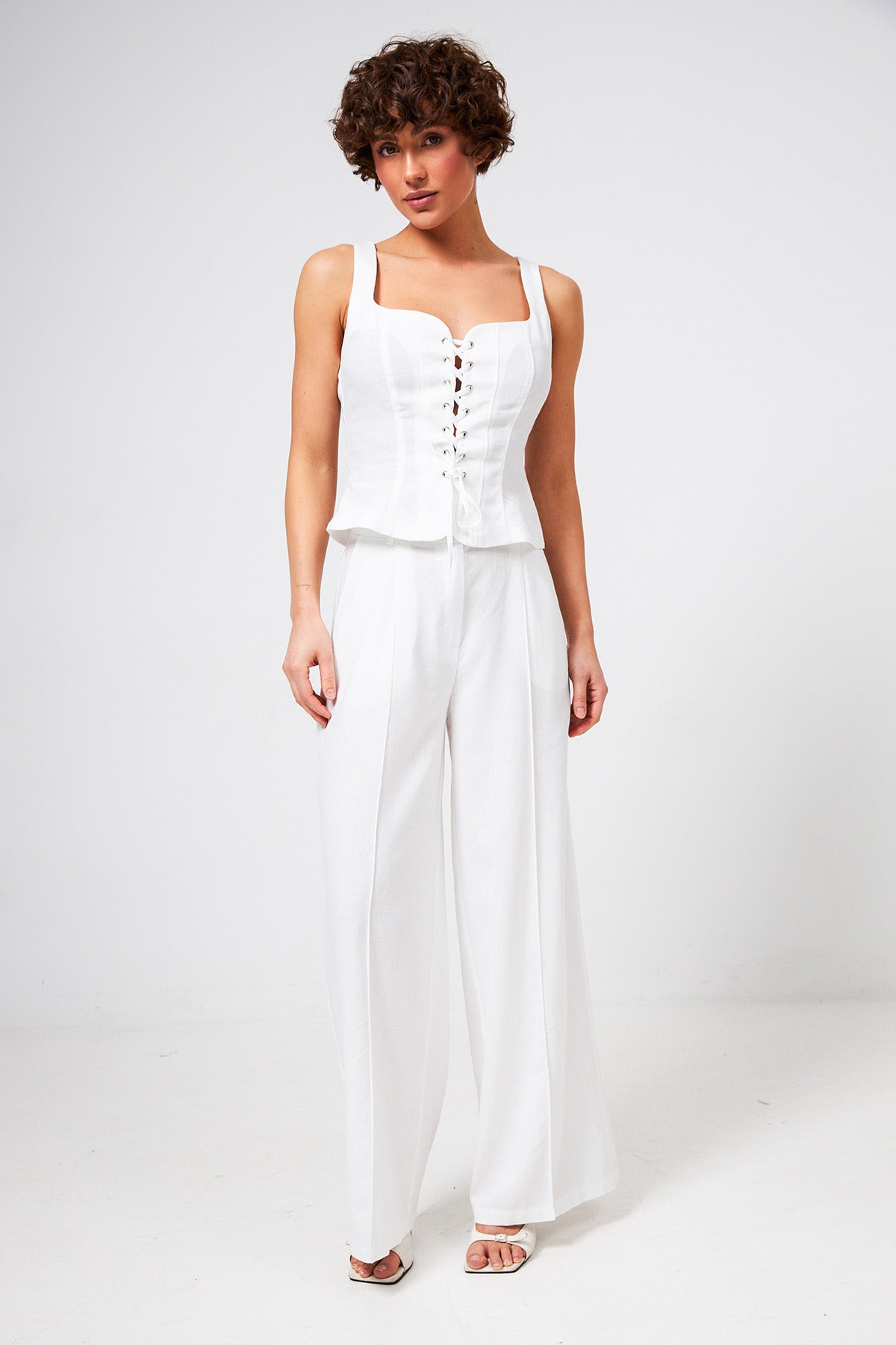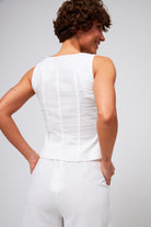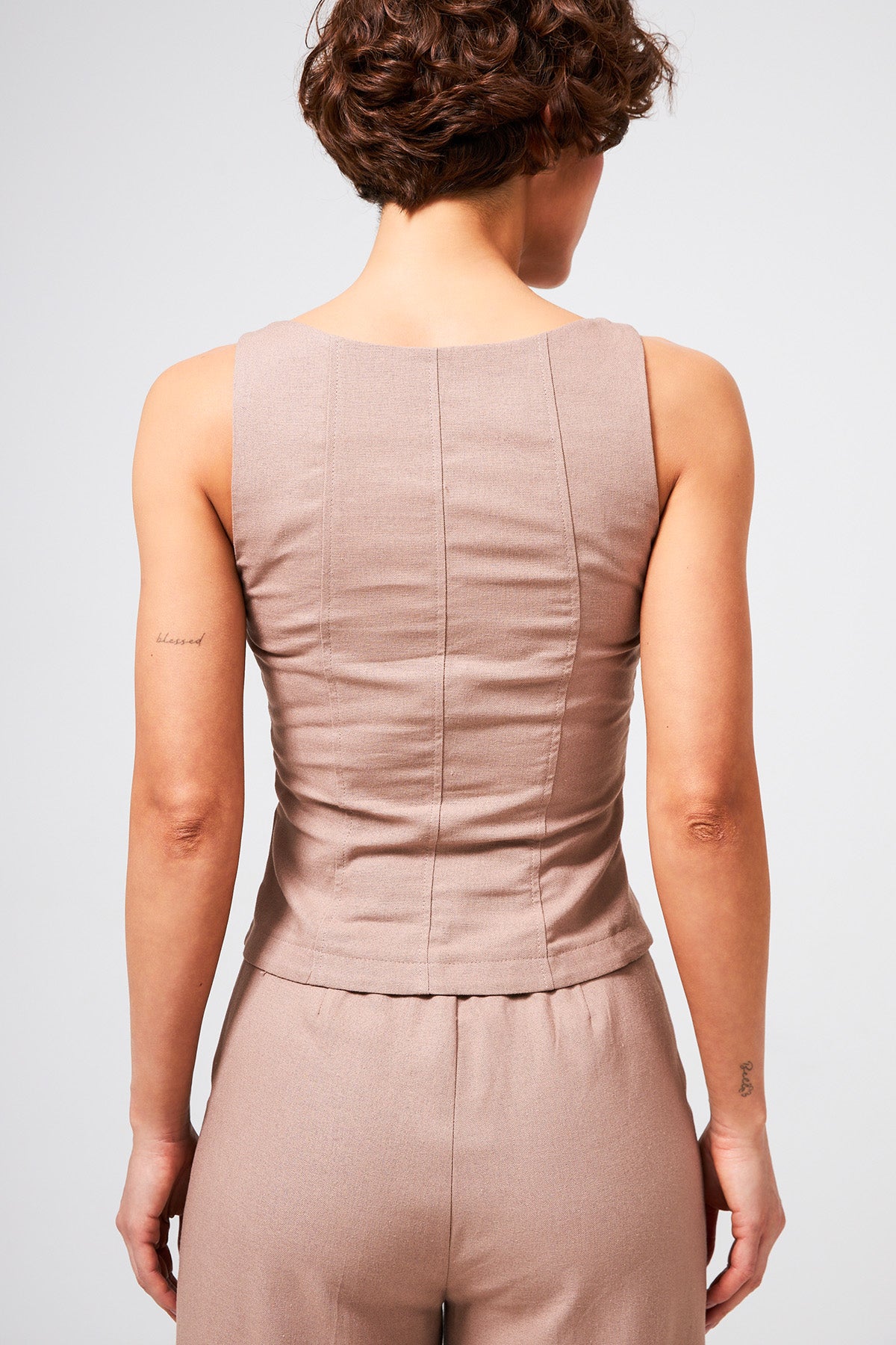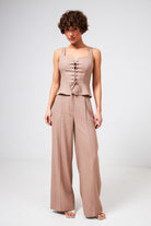 Жилет класичного крою, доповнений стильним елементом — шнурівкою на талії, яка дозволяє регулювати посадку та створювати жіночний силует.
