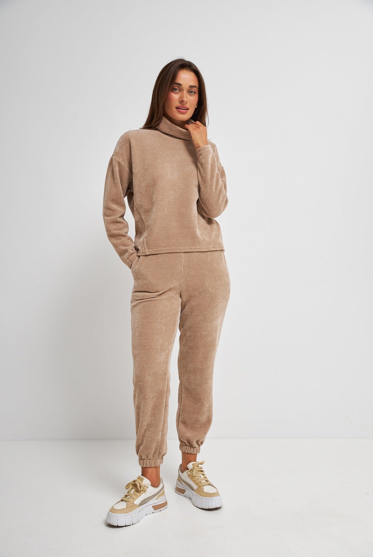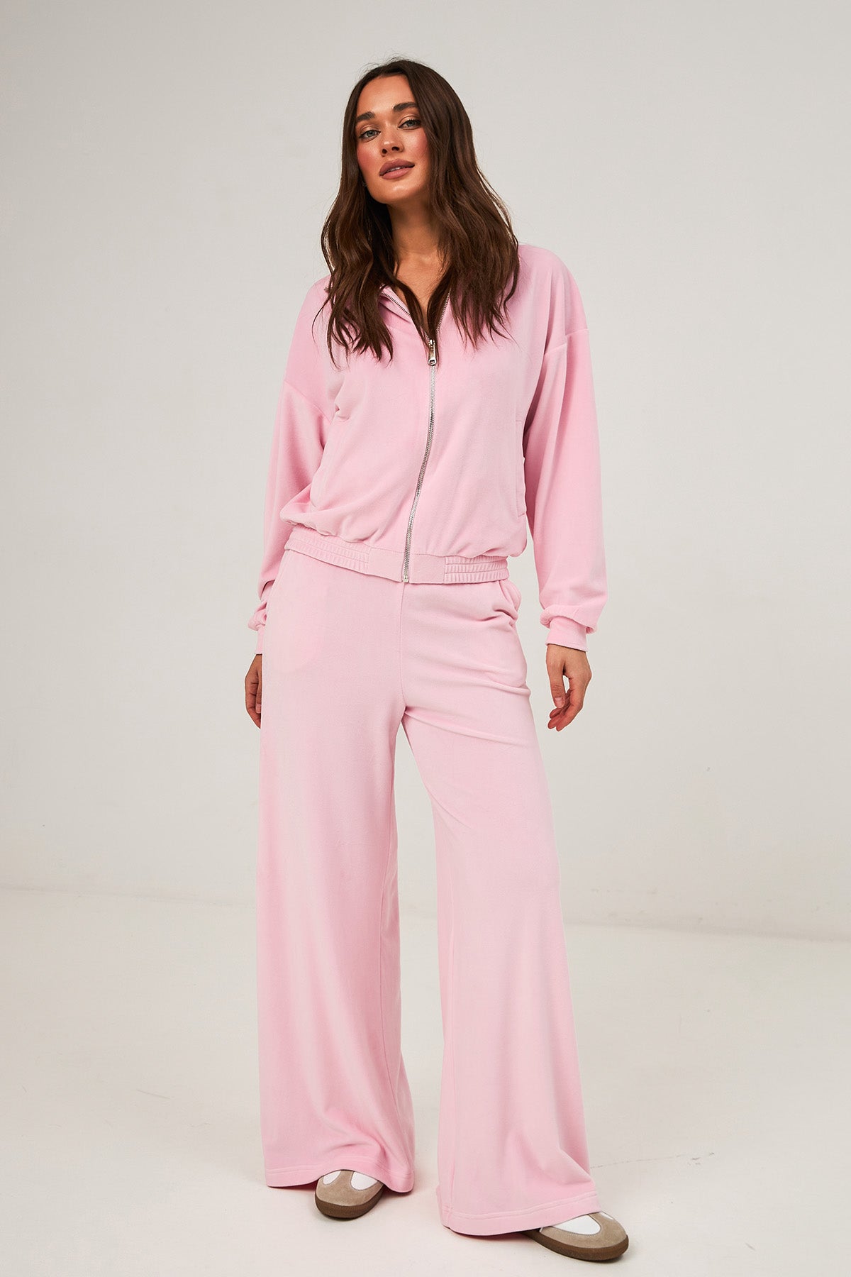 Відчувай себе як вдома, де б ти не була. Ми створили ці штани для тих, хто не готовий обирати між бездоганним стилем та абсолютним комфортом. М'який велюр з благородним відблиском перетворює домашній затишок на елегантний вуличний образ.
