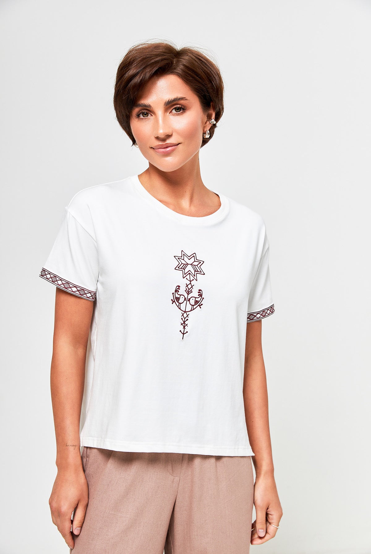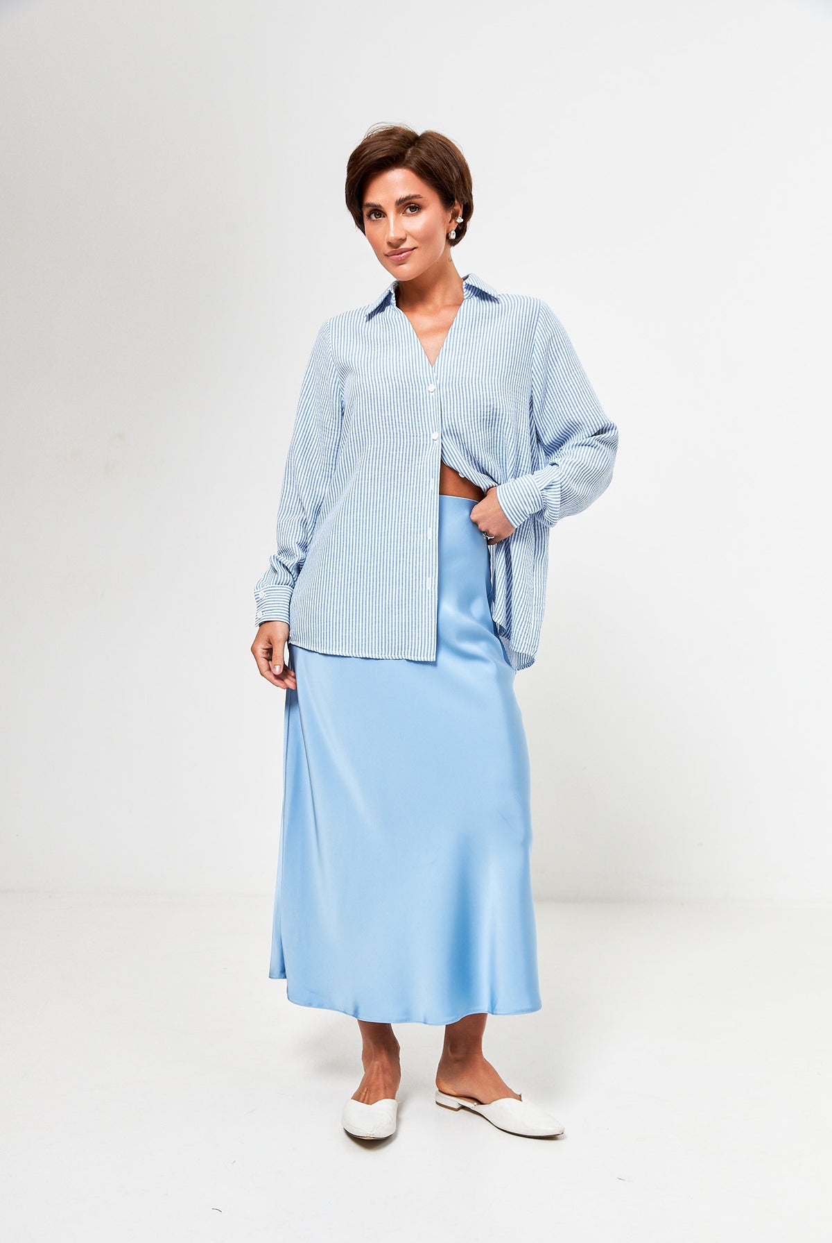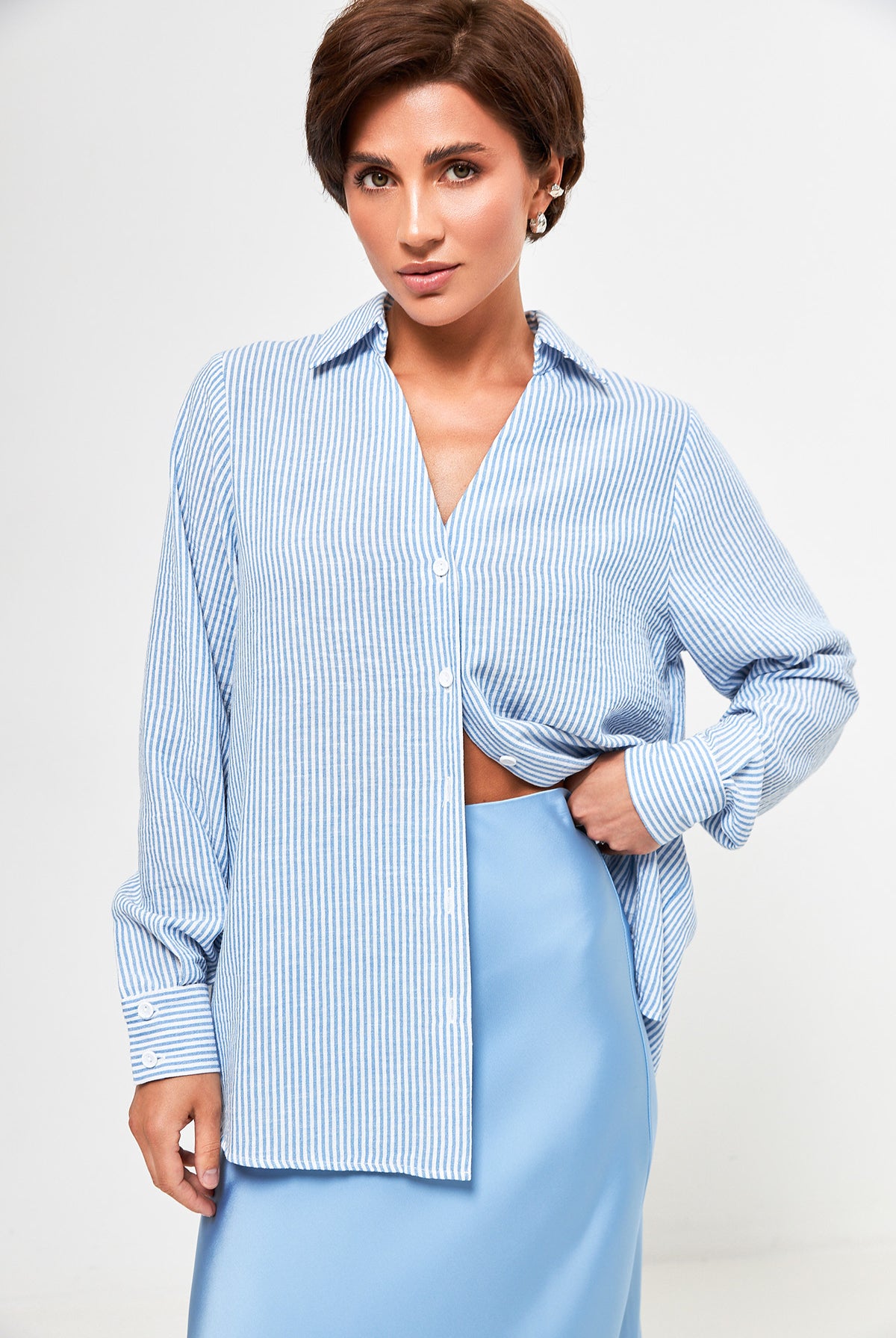 Модель із коротким рукавом, трендовою довжиною та елегантним коміром легко поєднується з джинсами, шортами чи спідницями. Зав’язка під грудьми додає акценту та підкреслює талію.