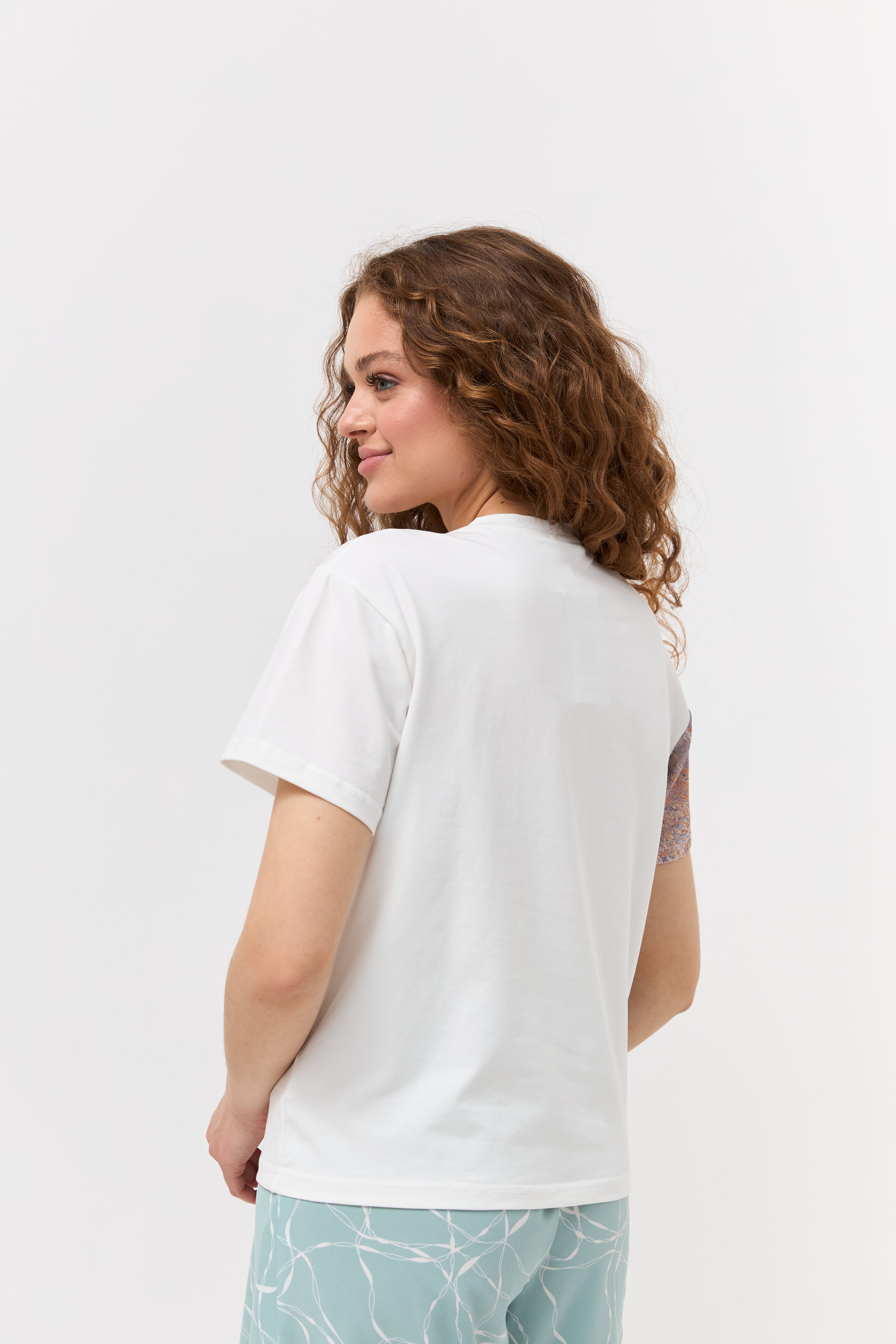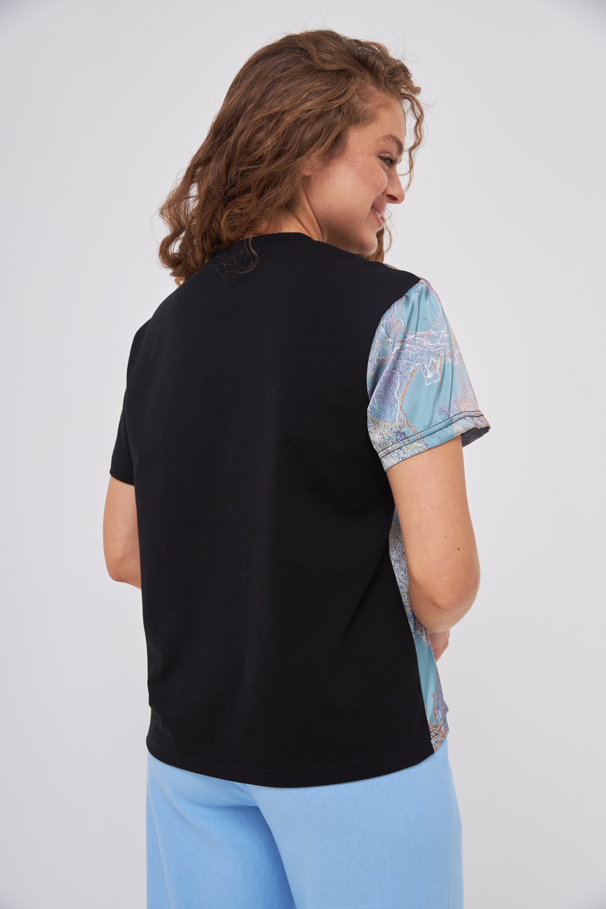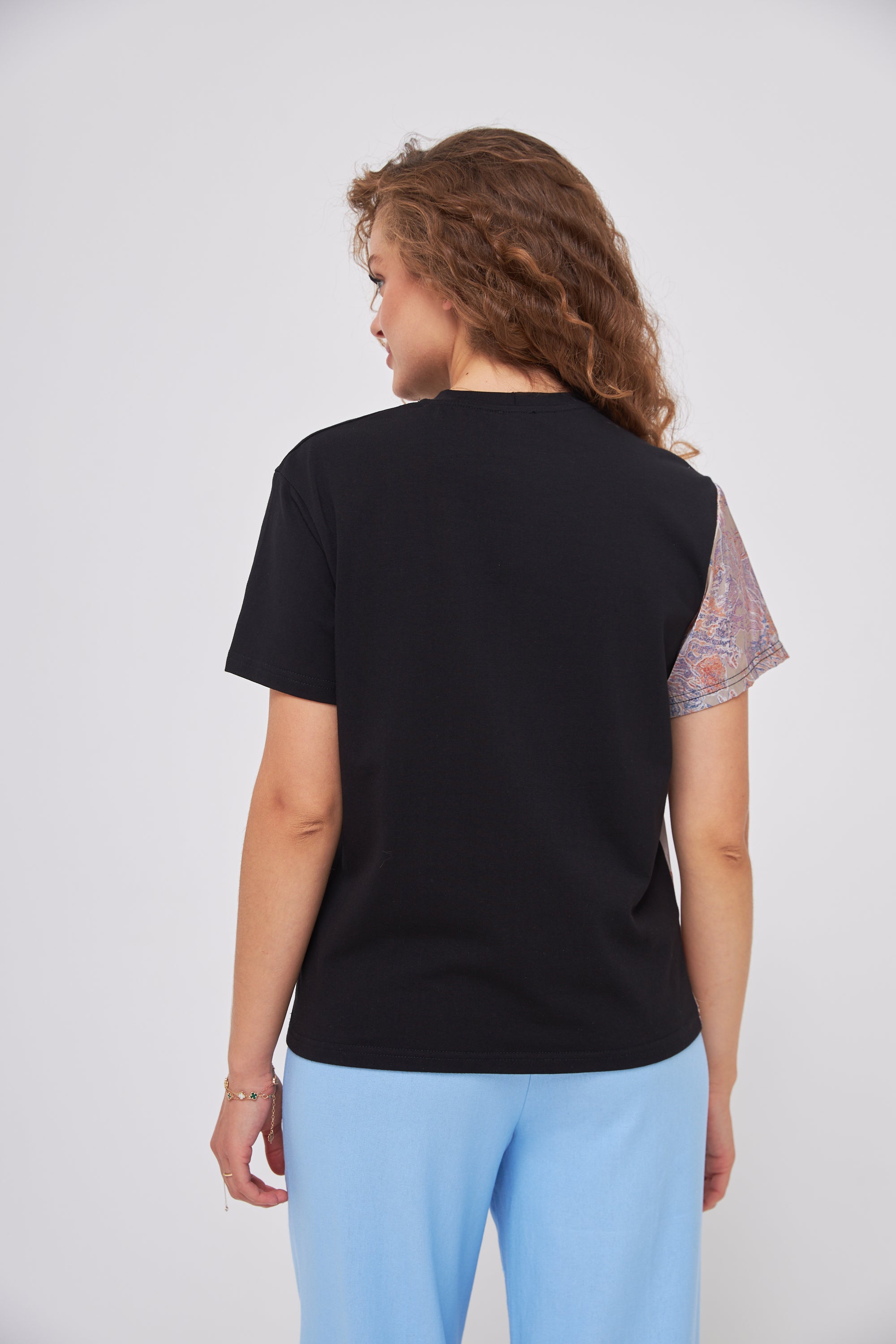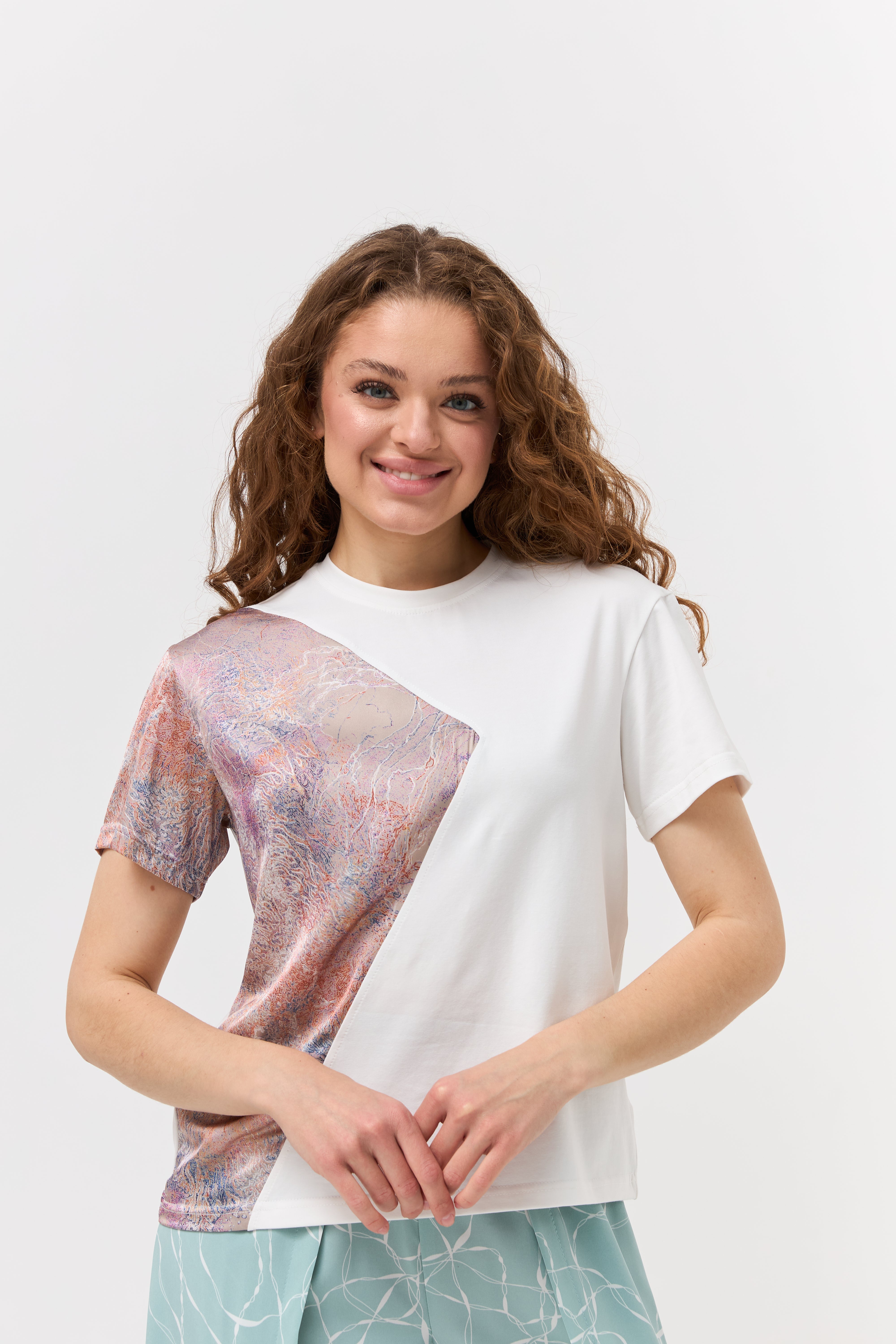 Поєднайте розкіш та комфорт з нашою стильною жіночою футболкою. Одна частина футболки виконана з ніжного та струмуючого шовку Армані з вишуканим абстрактним принтом, що додає образу витонченості та оригінальності. Друга частина виготовлена з м'якої та дихаючої кулірної гладі, що забезпечує приємні відчуття протягом усього дня.