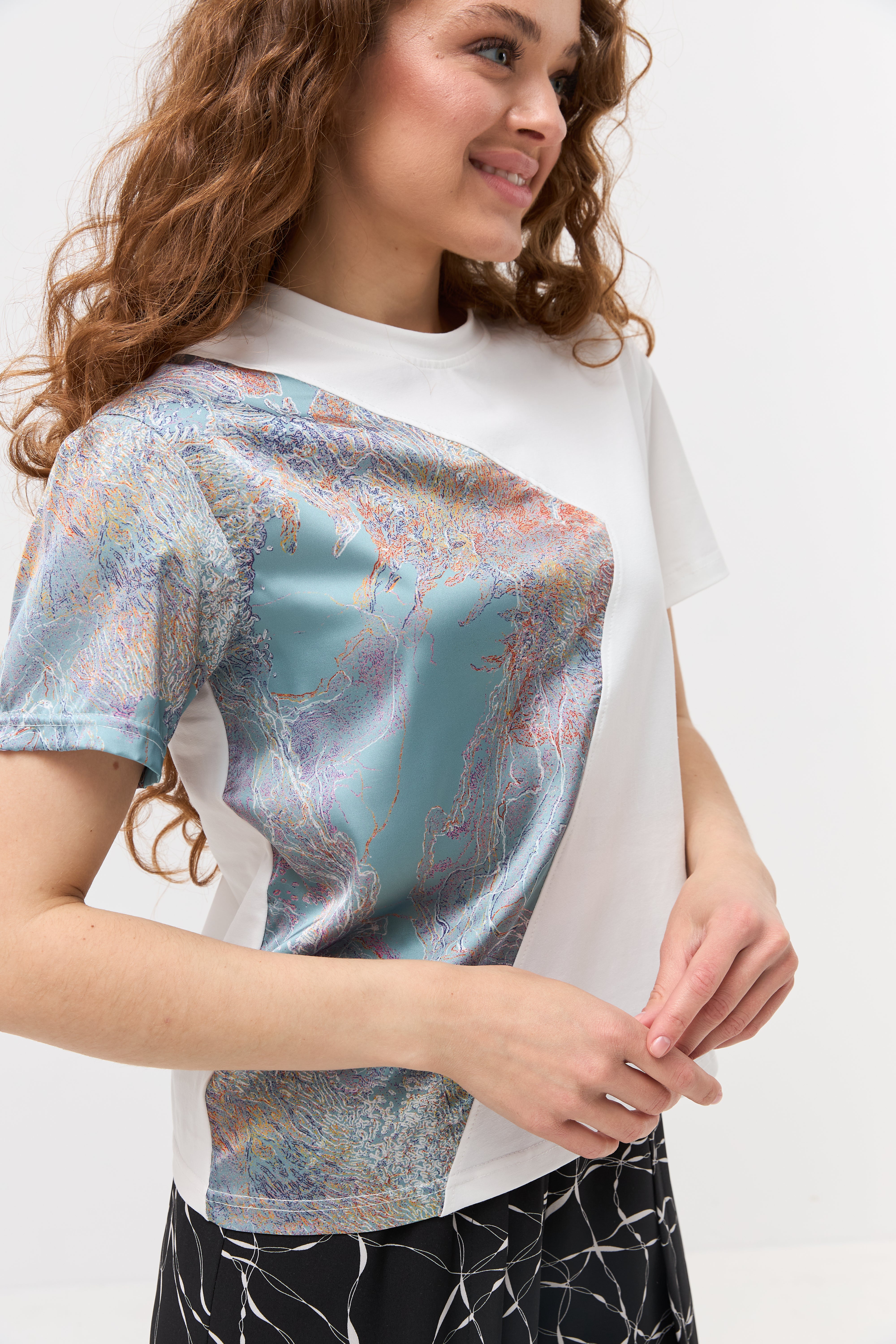 Елегантна жіноча футболка з комбінації шовку Армані та куліру з оригінальним принтом.