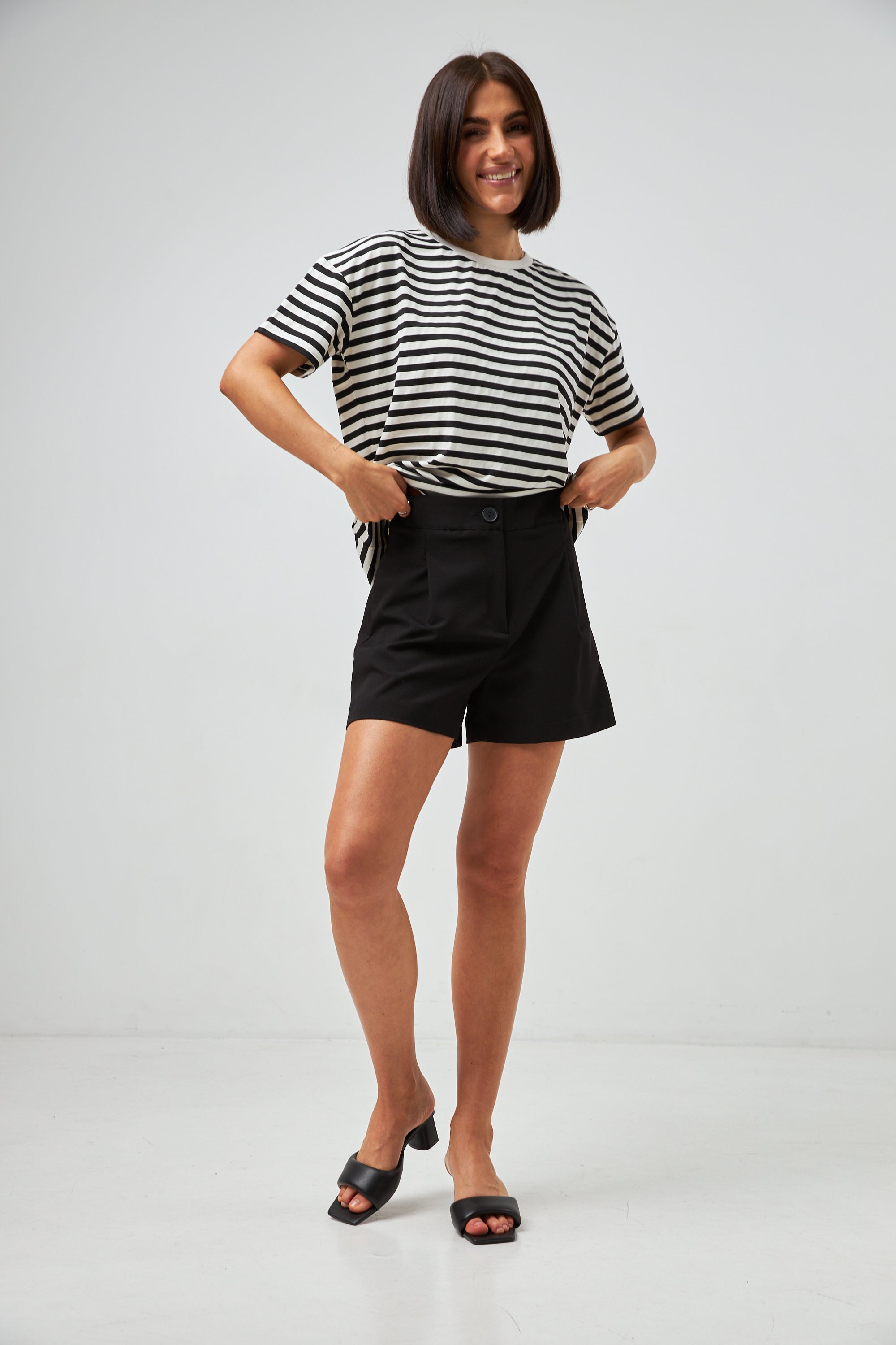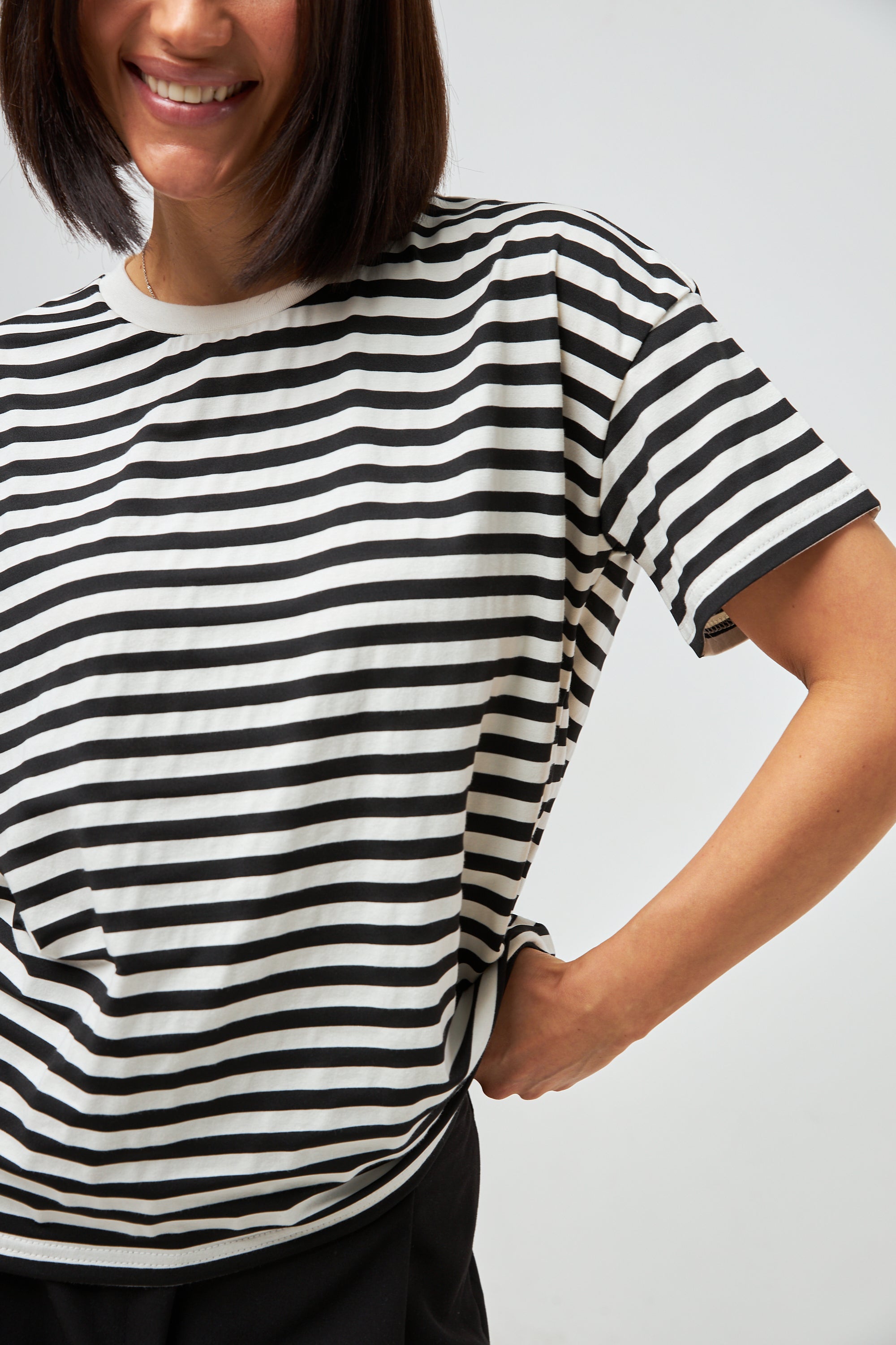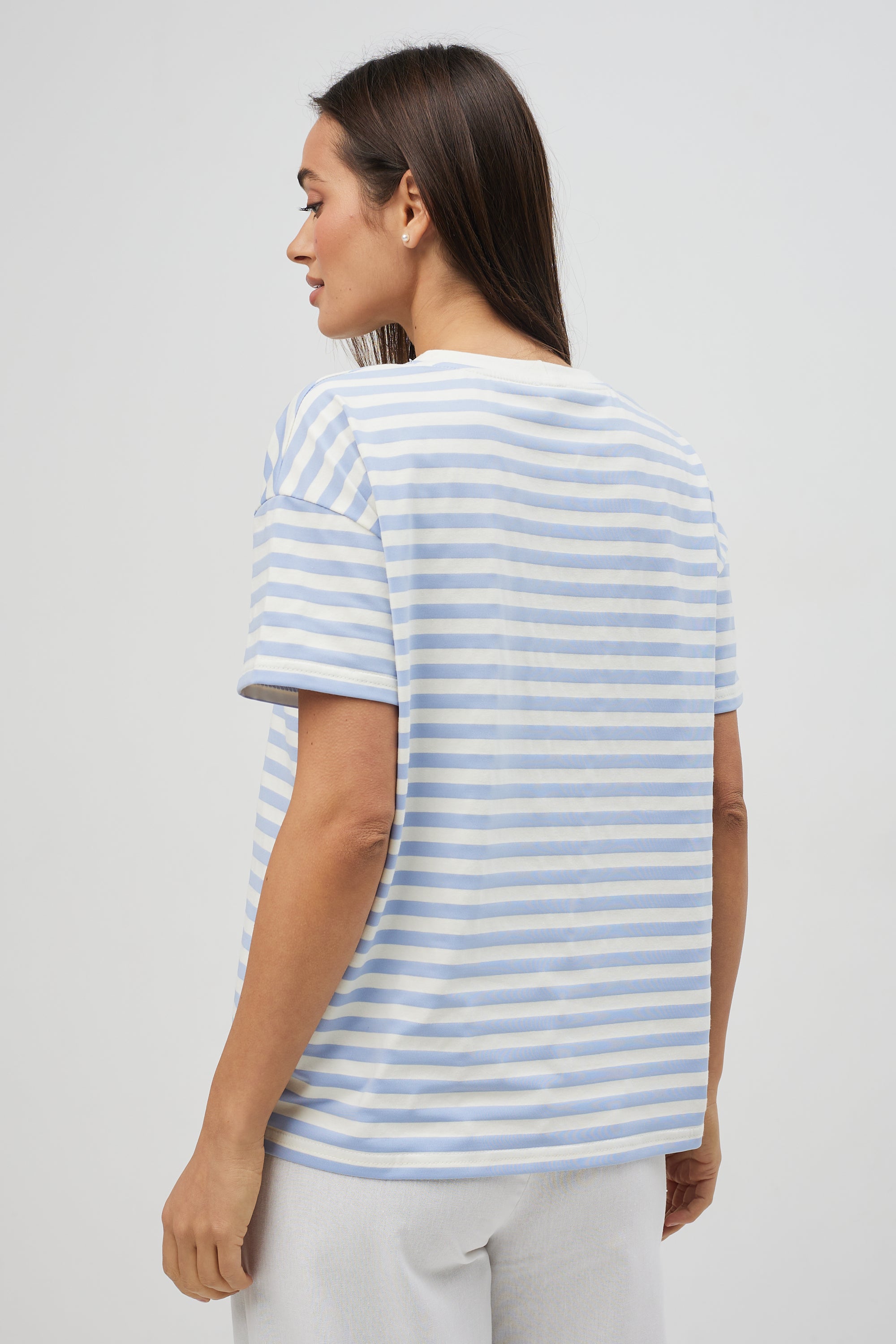 Оновіть свій гардероб цією модною футболкою в смужку з оригінальним дизайном. Виготовлена з м'якої та дихаючої бавовняної тканини, вона забезпечує комфорт та зручність у носінні. Футболка має вільний крій, що підходить для будь-якого типу фігури, а класичний смугастий принт додає їй елегантності. Ідеально поєднується з різними елементами гардеробу для створення стильних повсякденних образів.
