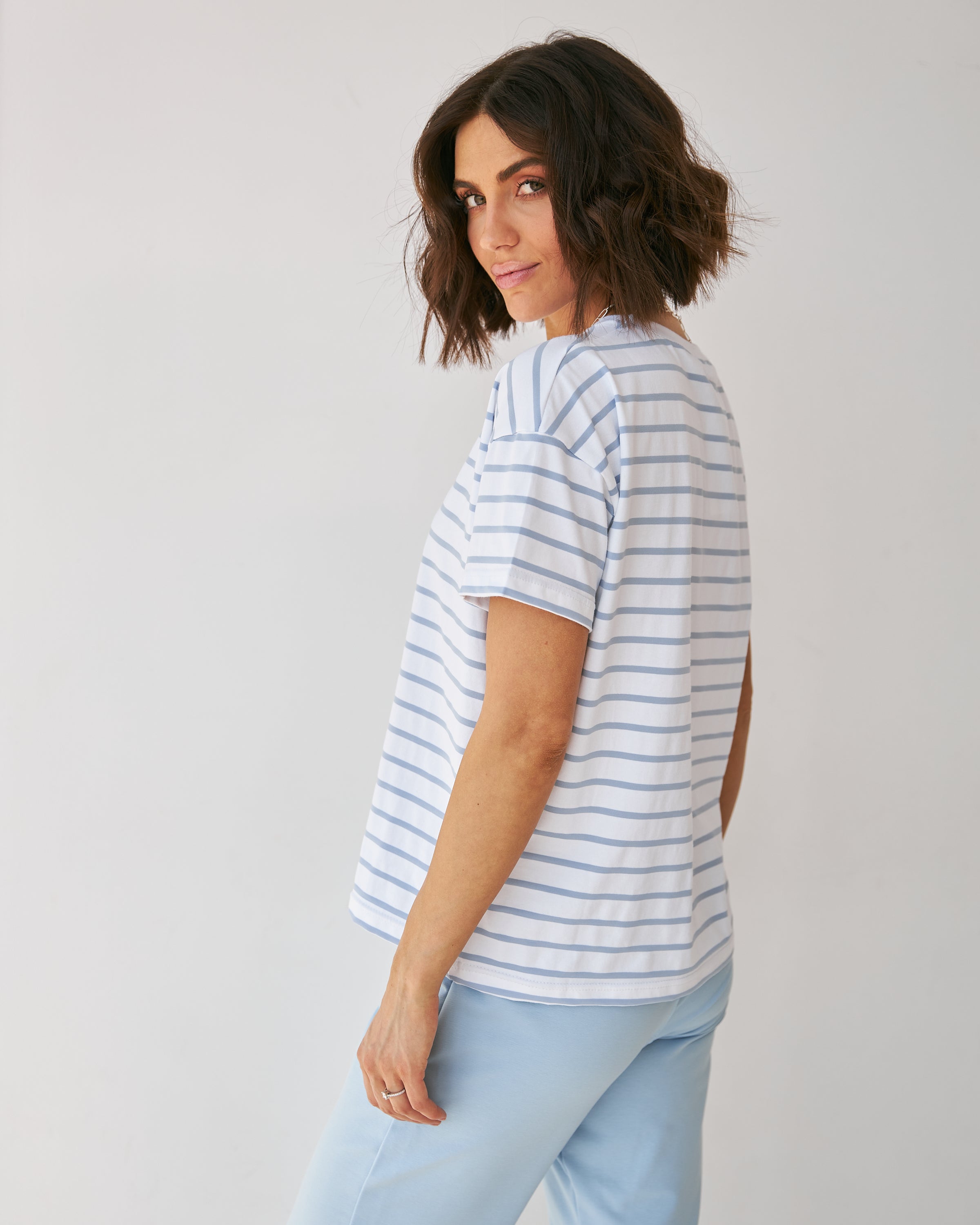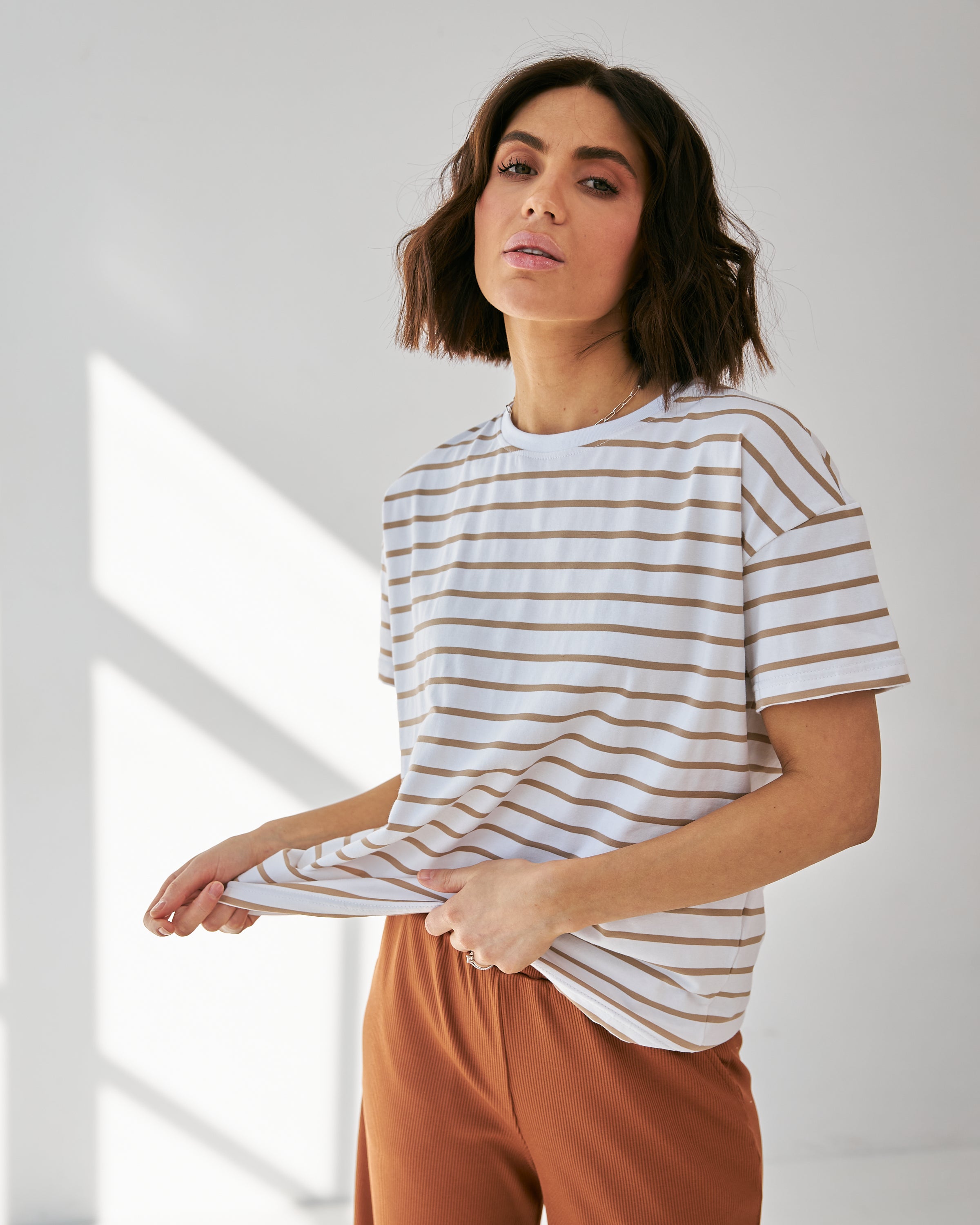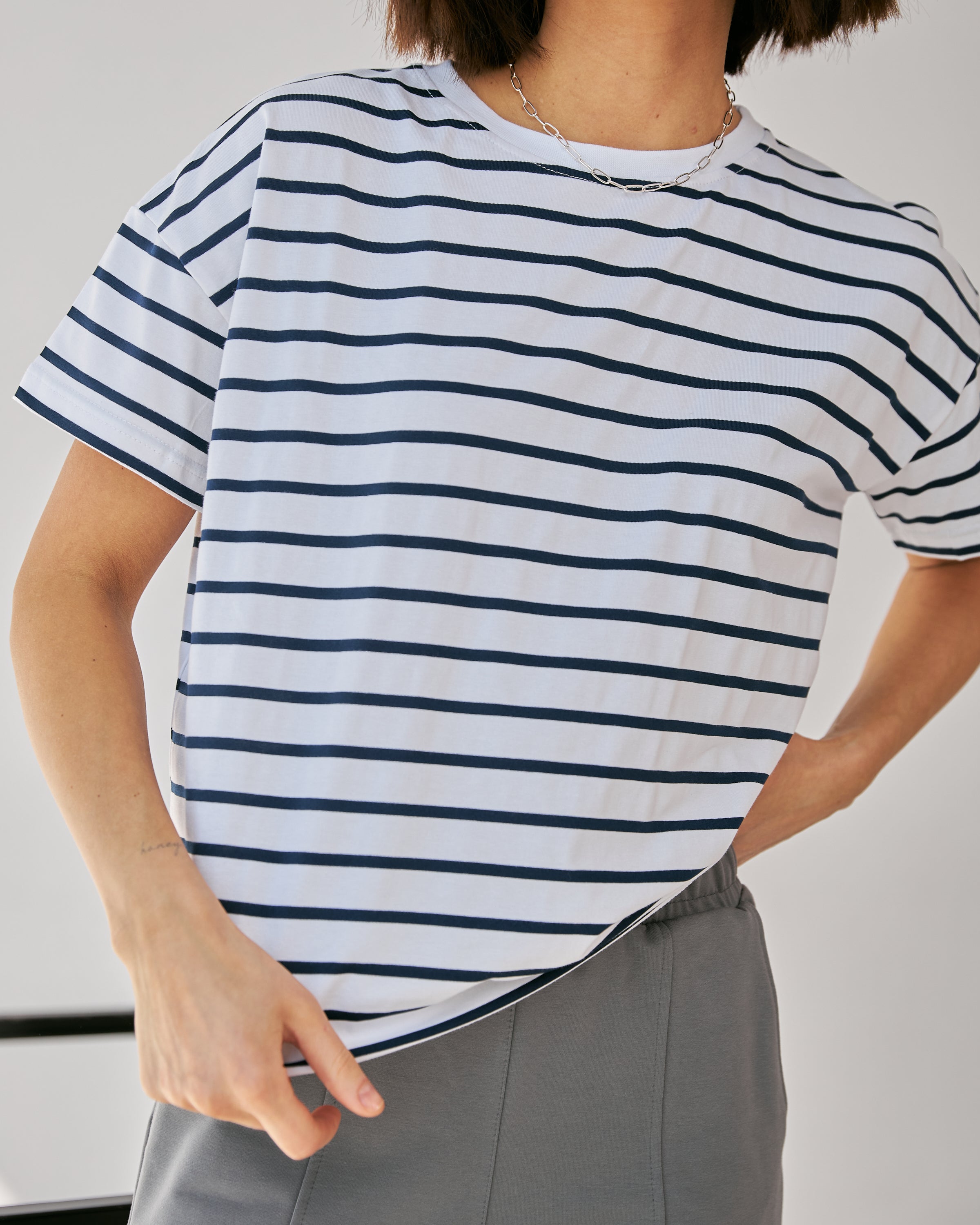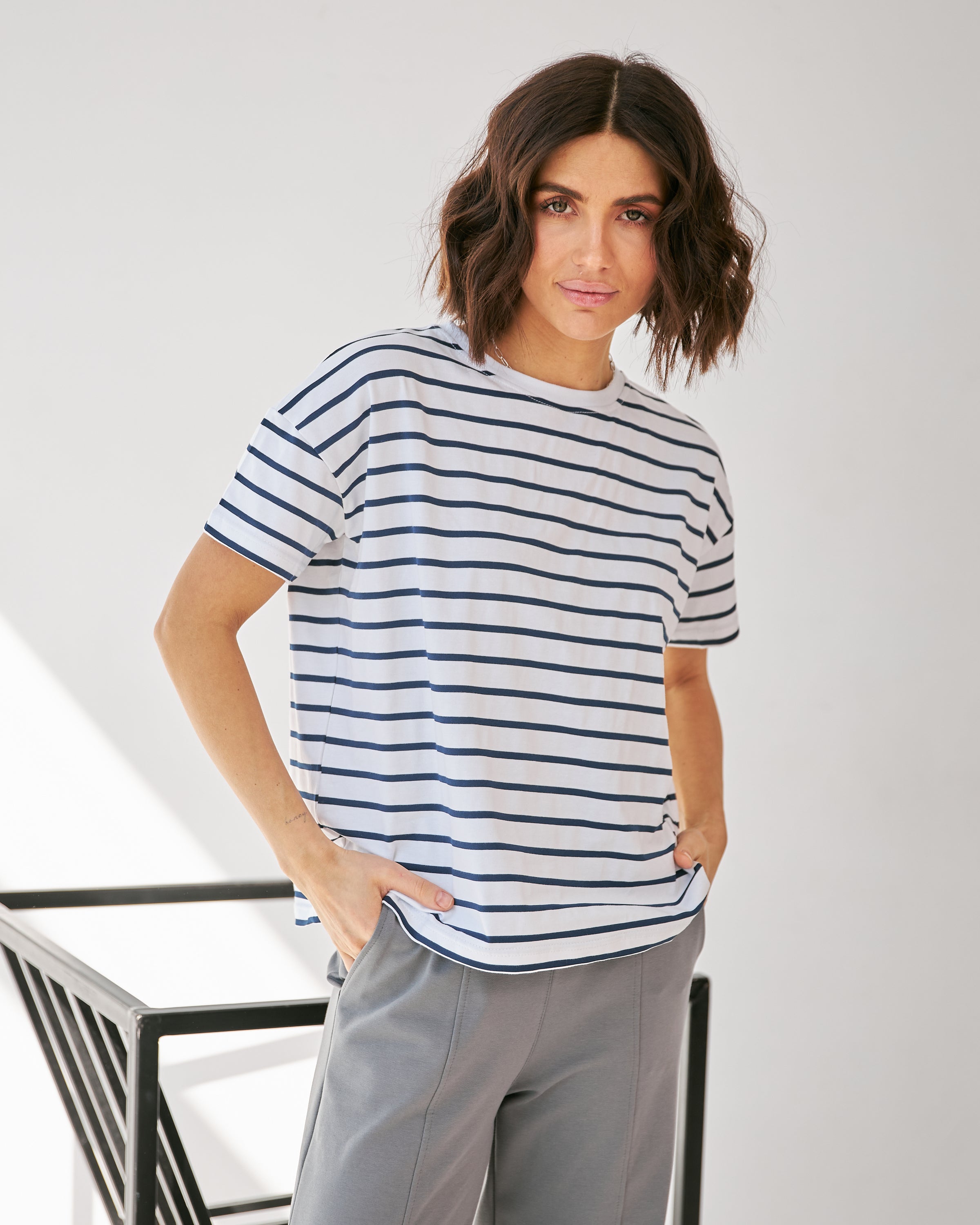 Футболка вільного крою з полоскою — класика, що не виходить з моди. Її стильний смужковий принт додає свіжості образу, а вільний крій забезпечує комфорт і свободу рухів. Легка тканина і нейтральний дизайн роблять цю футболку універсальним вибором для будь-якої пори року та різних стилів.