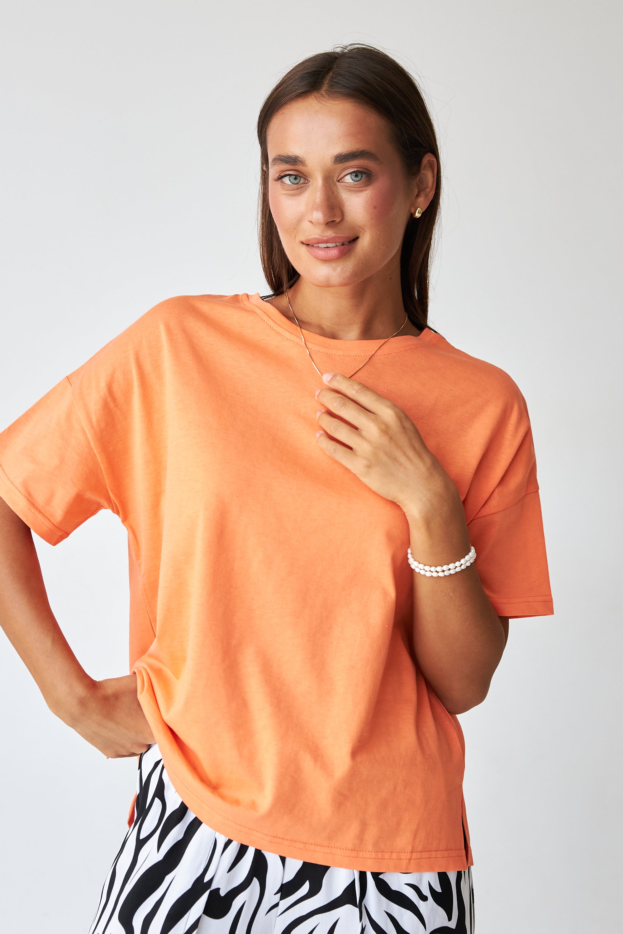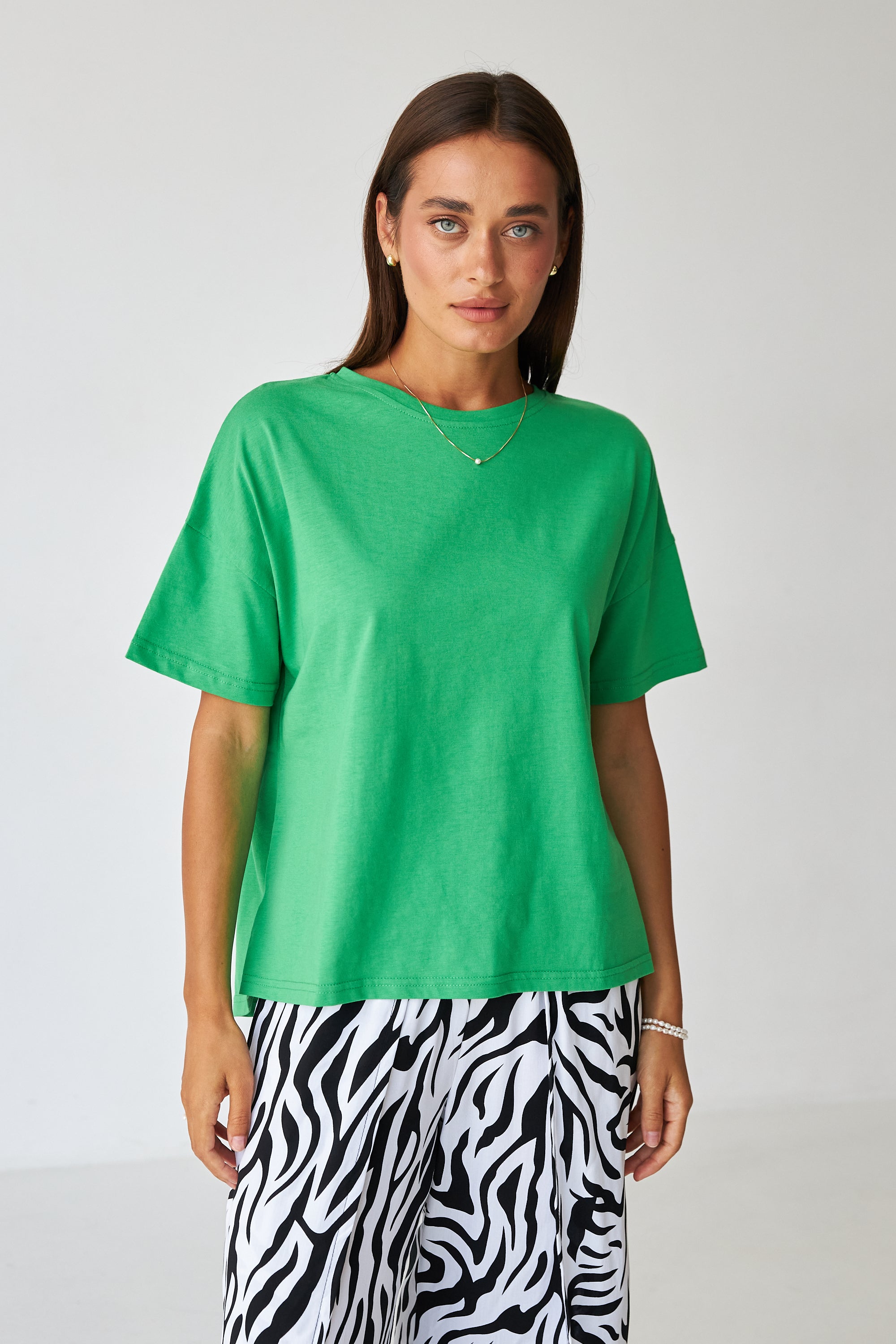 Стильна жіноча футболка з подовженою спинкою, виготовлена з м'якого та приємного до тіла матеріалу. Круглий виріз горловини та короткі рукави забезпечують класичний вигляд, а асиметричний крій додає сучасності