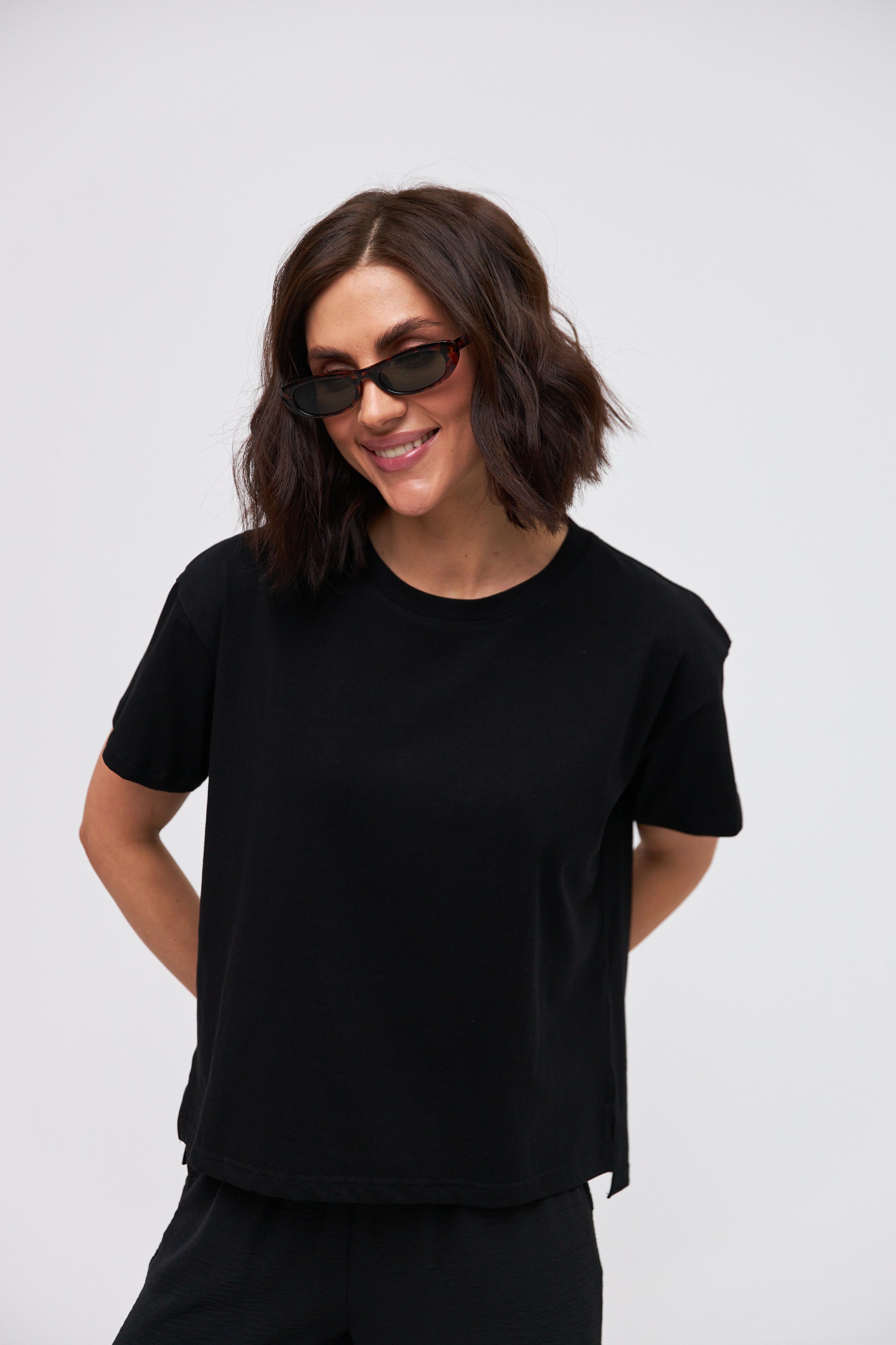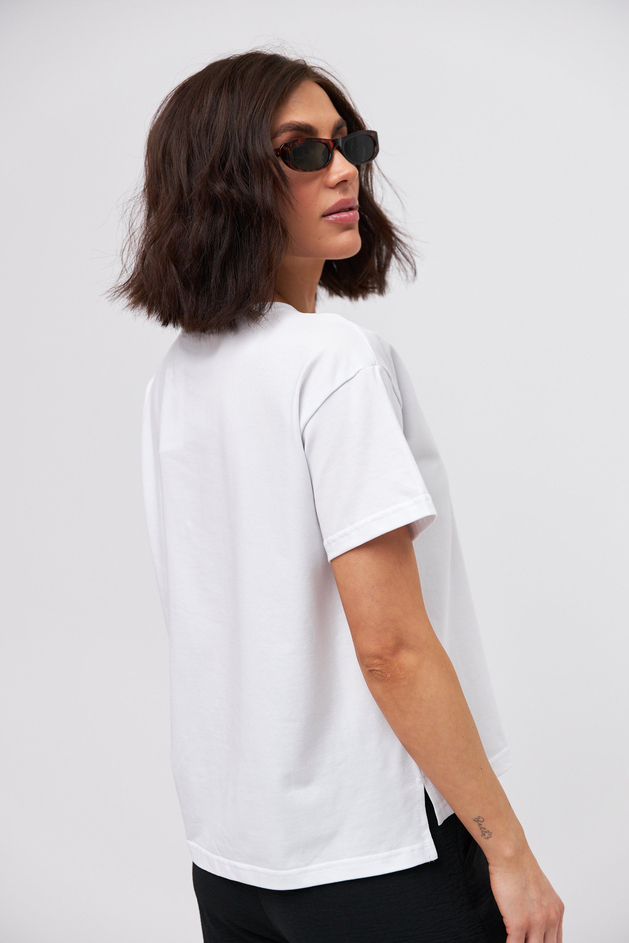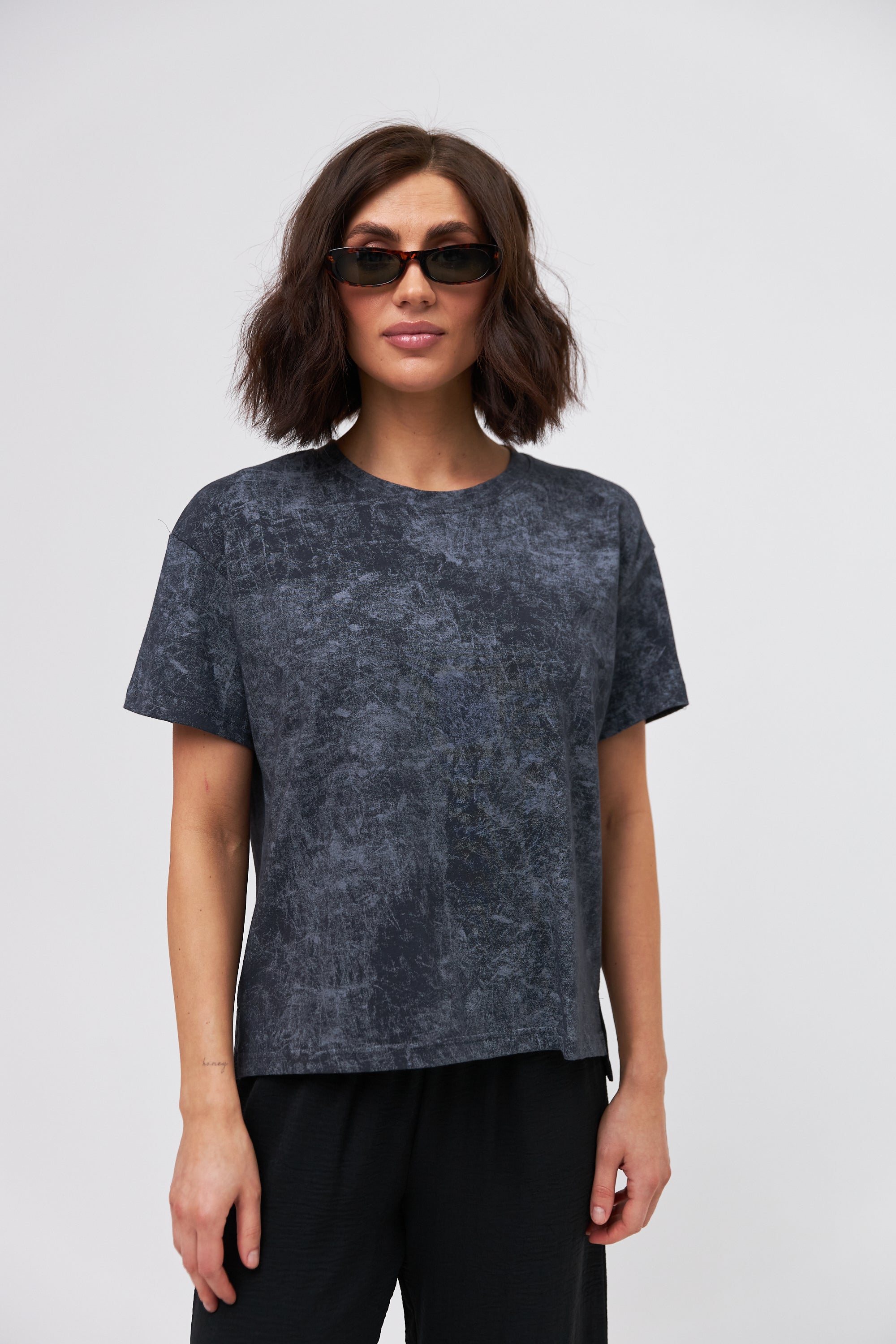 Стильна жіноча футболка прямого крою з бічними розрізами, що додають оригінальності та забезпечують свободу рухів. Виготовлена з м'якого та еластичного матеріалу, який приємно прилягає до тіла. Круглий виріз горловини та короткі рукави роблять цю модель ідеальним вибором для повсякденного носіння в теплу пору року.