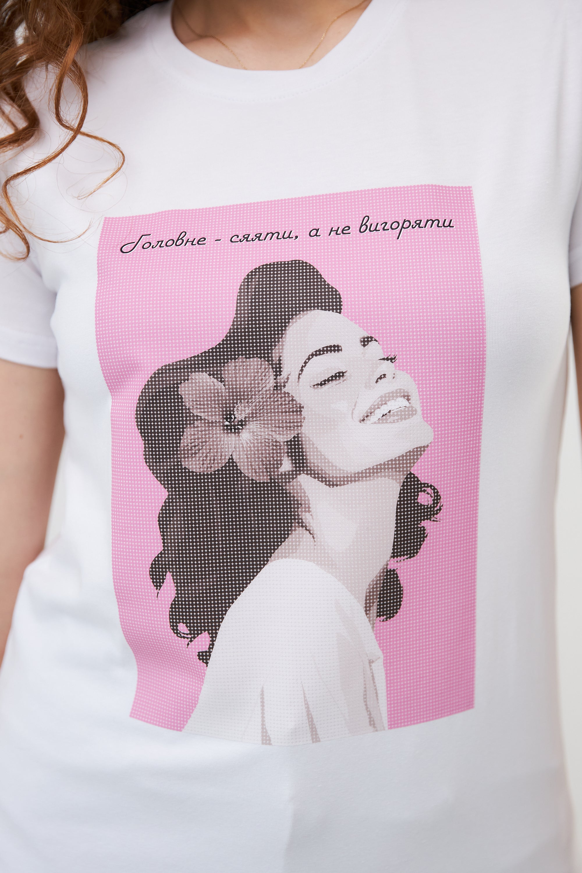Над зображенням розташований напис, виконаний витонченим шрифтом, що додає футболці особливого шарму.