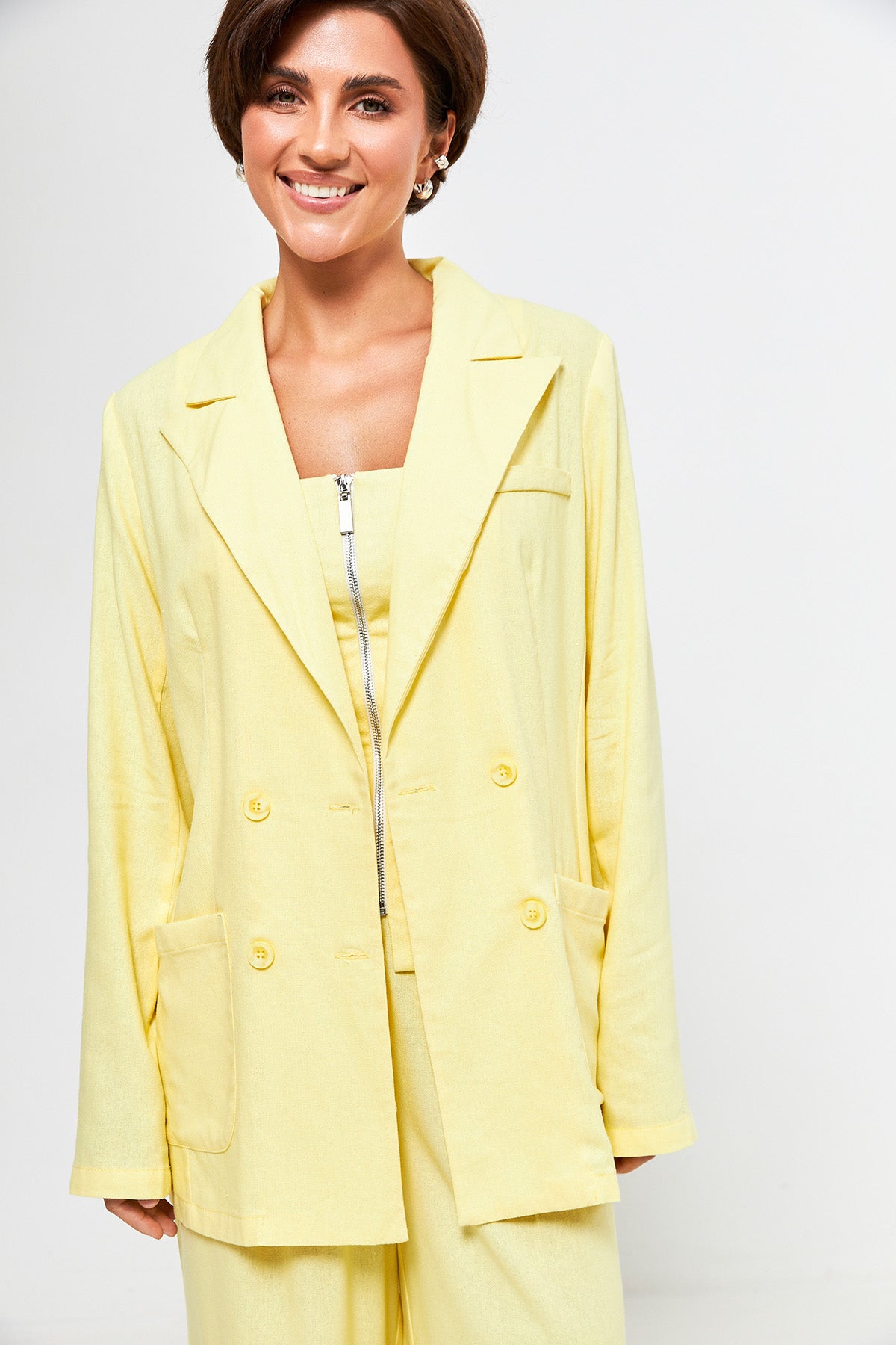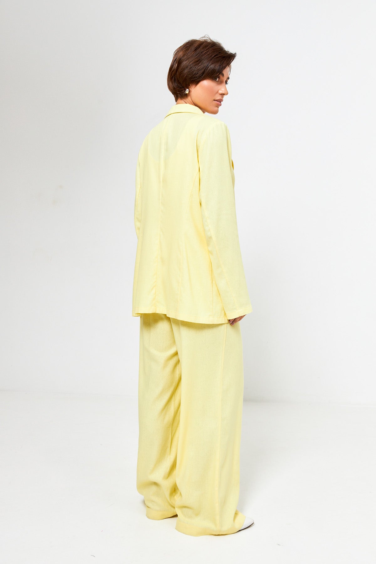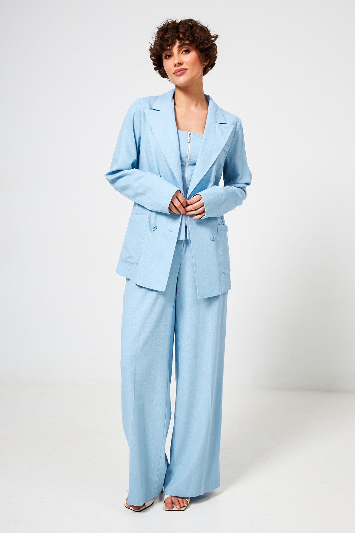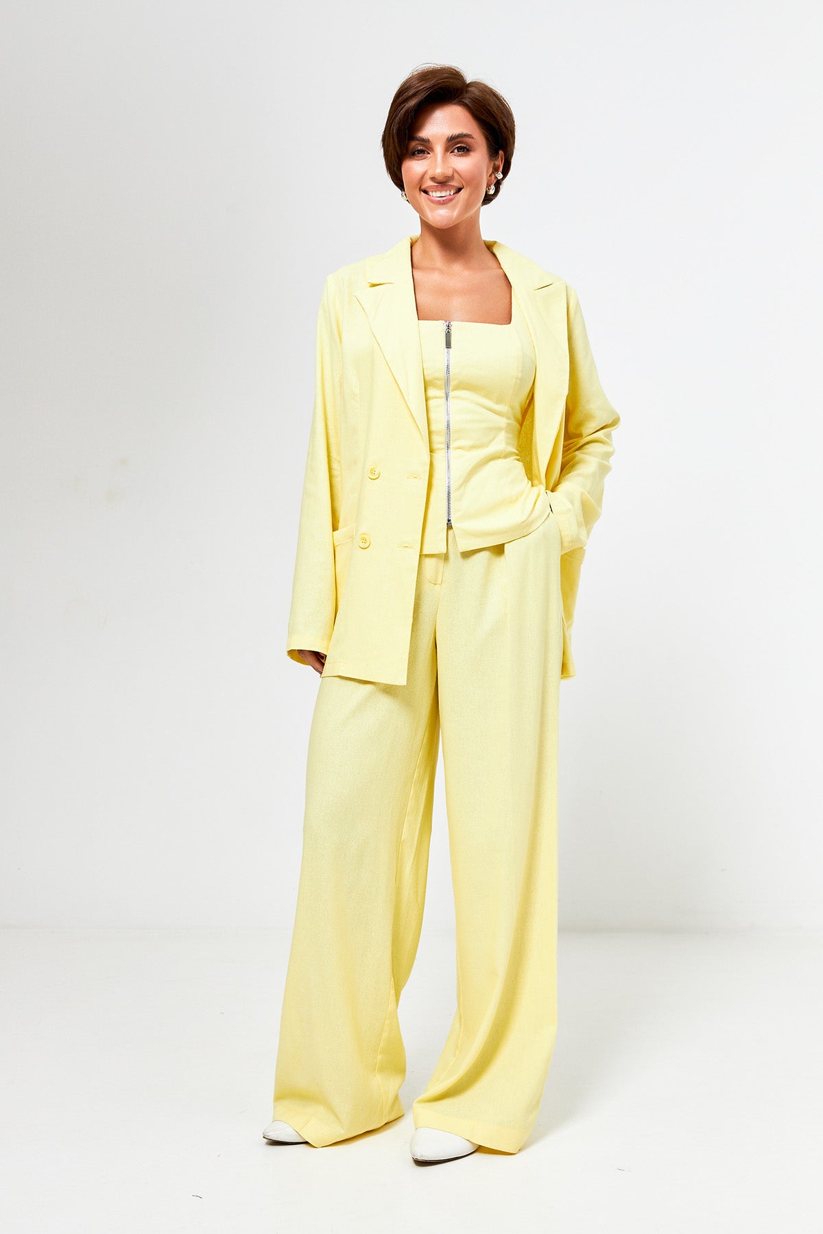 Жакет, виконаний із високоякісного льону, — це маст-хев для літнього гардероба. Справжня магія костюма Франческа розкривається саме у поєднанні всіх трьох елементів: структурований жакет задає статусність, брюки створюють нескінченну лінію силуету, а жилет із акцентною шнурівкою стає тим самим «секретним інгредієнтом», що ідеально збирає образ воєдино.