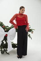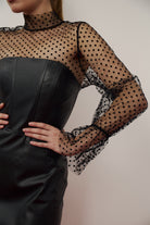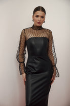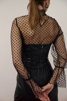 Эта блузка из прозрачной сетки — идеальный выбор для смелого праздничного образа. Мелкий горошек (полька-дот) и длинные рукава-клеш добавляют трендовости. Высокий воротник-стойка и тонкий трикотажный топ на бретелях в комплекте. Идеально сочетается с черными брюками или юбкой-мини. Будьте звездой вечеринки!