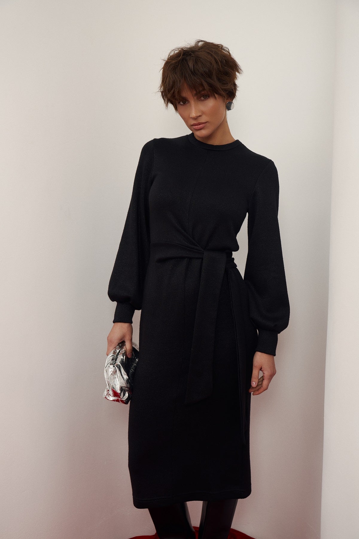 Чорна трикотажна сукня міді з перекрутом та об'ємними рукавами