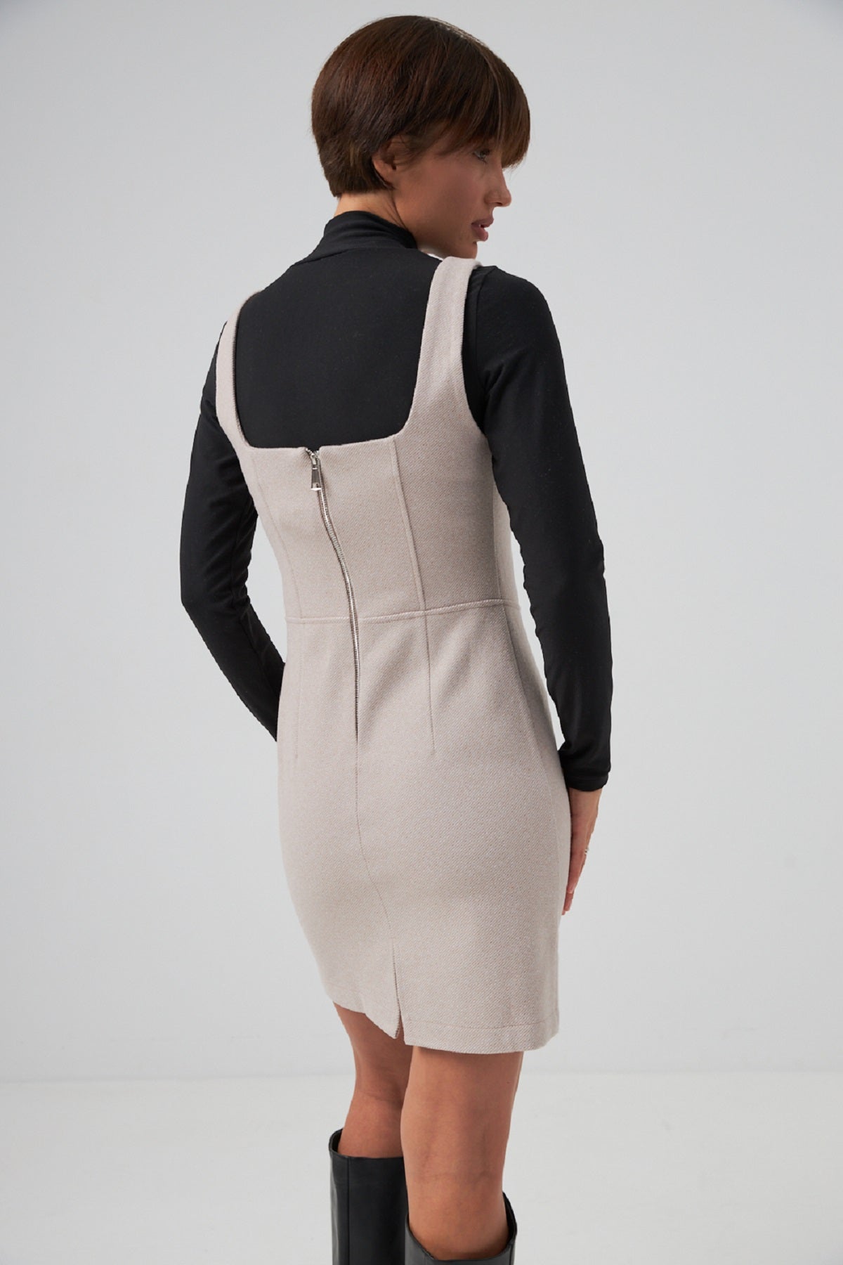 Цей елегантний сарафан створений, щоб підкреслити Вашу жіночність та витончений смак. Виготовлений з костюмної тканини, він ідеально тримає форму. Головна особливість — ліф у формі корсета, який акцентує талію та додає образу структурованості. Завдяки бежевому кольору та демісезонній (осінній) сезонності, сарафан є універсальною основою для стильних багатошарових образів: носіть його з базовою водолазкою, ошатною блузою чи строгою сорочкою, доповнюючи образ жакетом чи кардиганом для офісу чи повсякденного виходу.