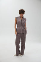 Модні широкі штани-палаццо — ідеальний вибір для створення стильного образу. Трендова вертикальна смужка візуально подовжує ноги. Висока посадка та вільний крій забезпечують комфорт протягом дня. Штани чудово підходять для ділового стилю, офісу та повсякденних виходів.