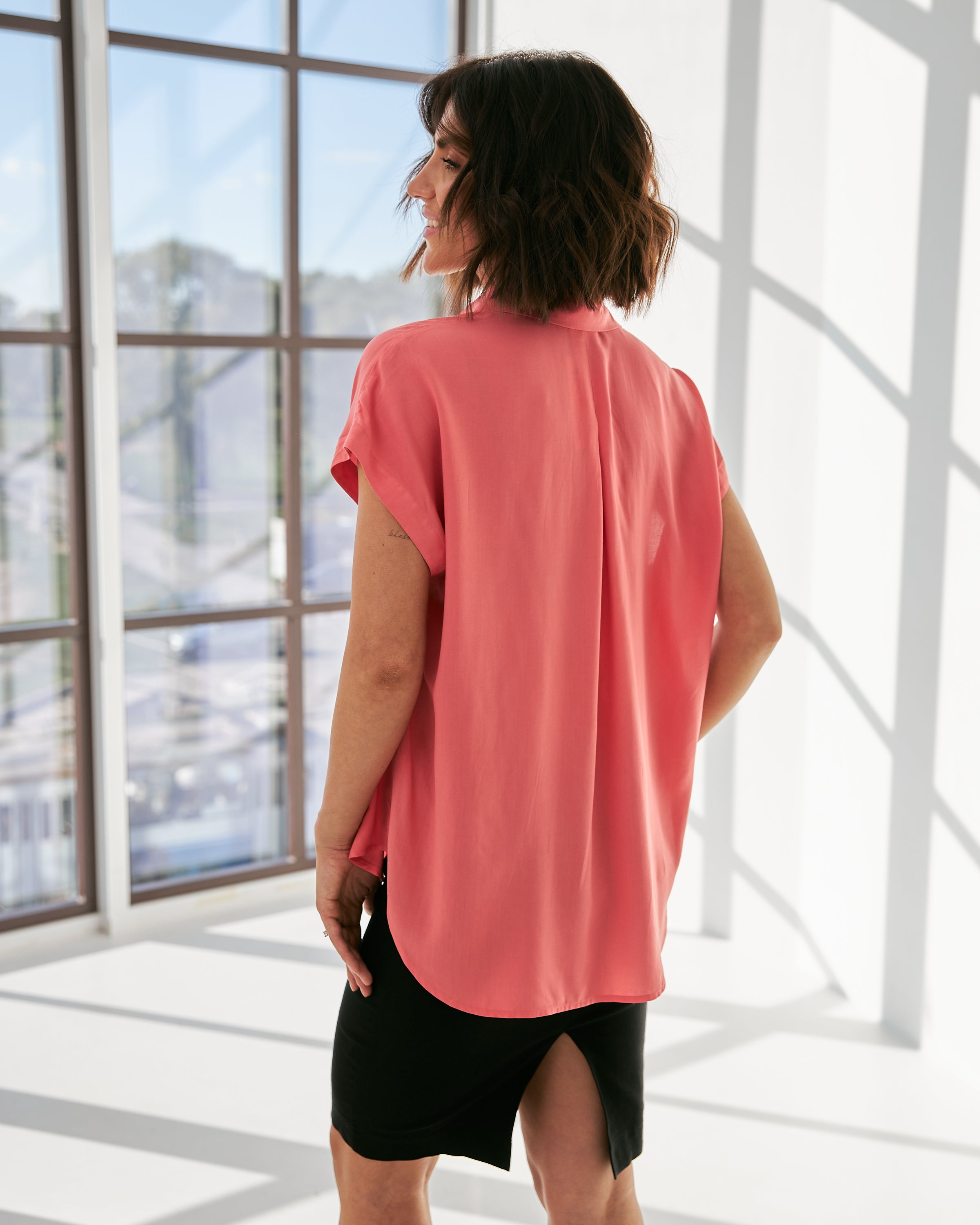 Ця сорочка поєднує в собі елементи класики та сучасного стилю. Завдяки спущеному плечу вона виглядає легко і романтично, додаючи вашому образу елегантності та витонченості.