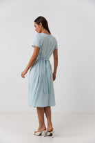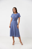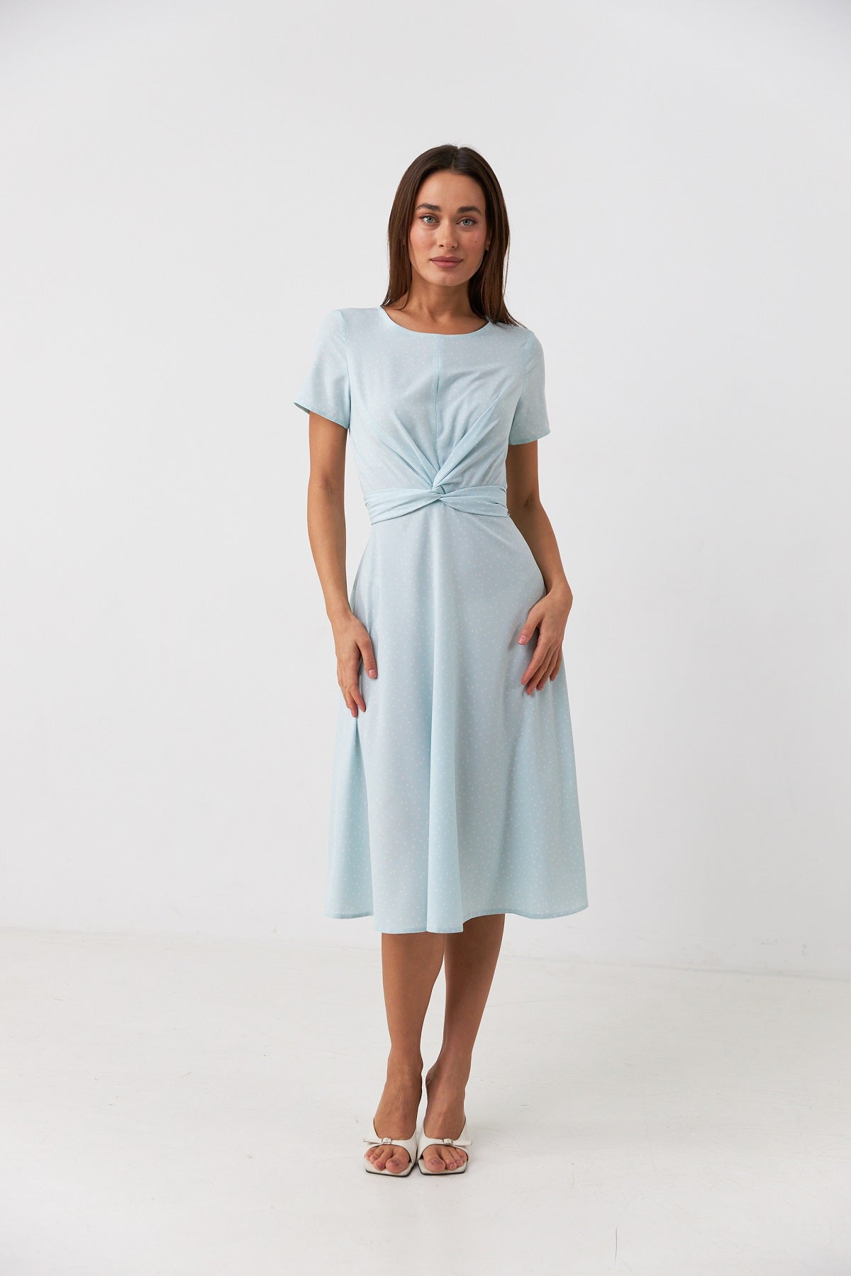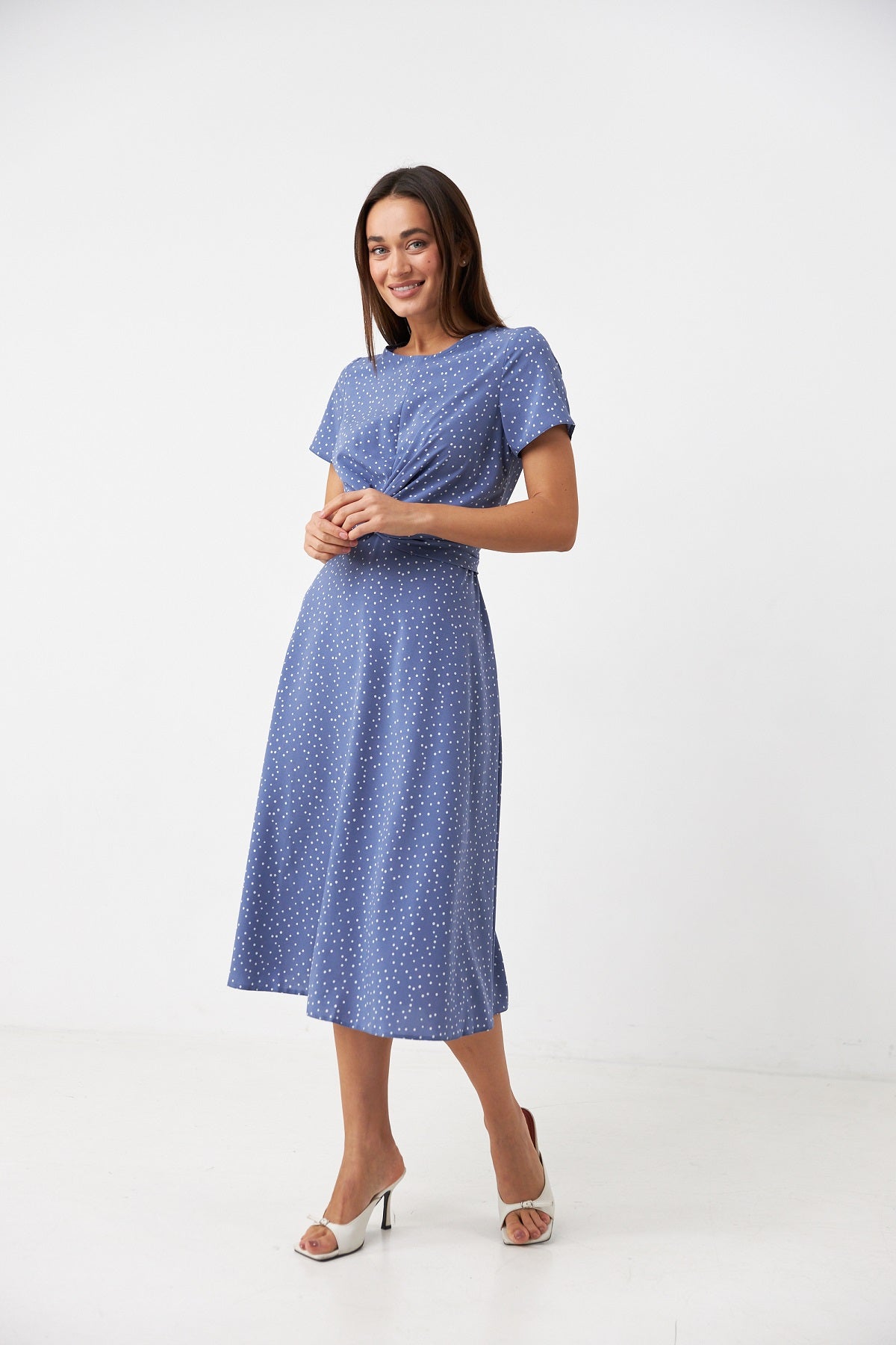 Сукня з перекрутом і короткими рукавами Ніжна та жіночна сукня міді довжини, створена для легких повсякденних образів. Виконана з м’якого дихаючого софту, який дарує комфорт у спекотні дні та приємно відчувається на тілі. Модель має злегка приталену посадку з акцентом на талії завдяки стильному перекруту спереду. Такий елемент додає образу динамічності та візуально моделює фігуру. Короткі рукави й округла горловина роблять силует витонченим, а довжина міді — універсальною для будь-якого типу фігури. Дизайн доповнений дрібним горошком на ніжному фоні, що надає образу легкості та романтичності. Ідеальний варіант для побачень, прогулянок або офісу в теплу пору року.
