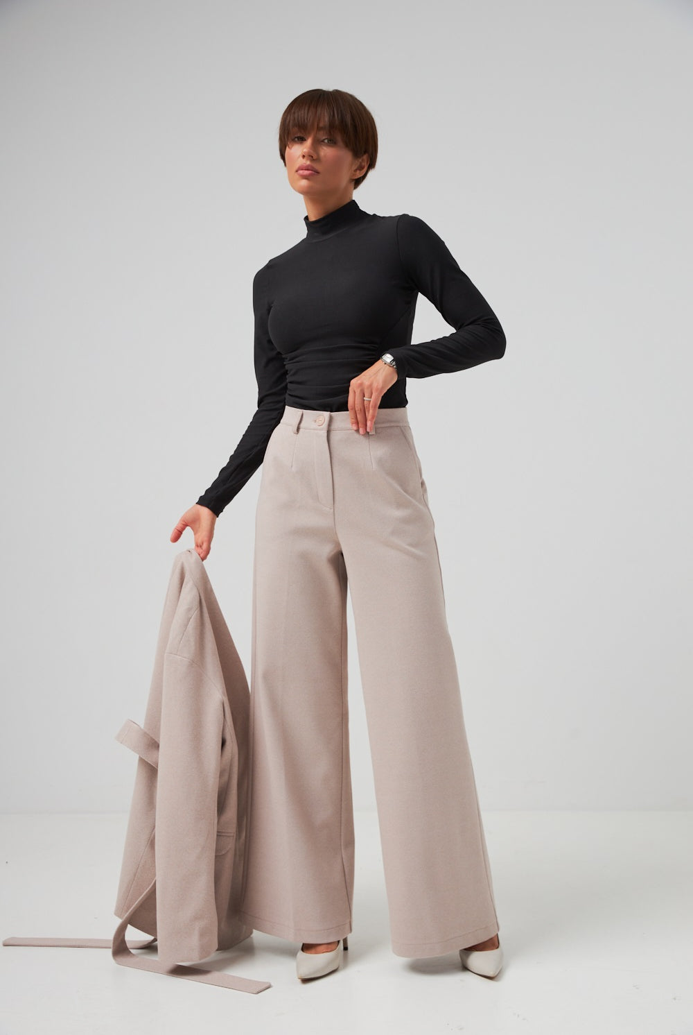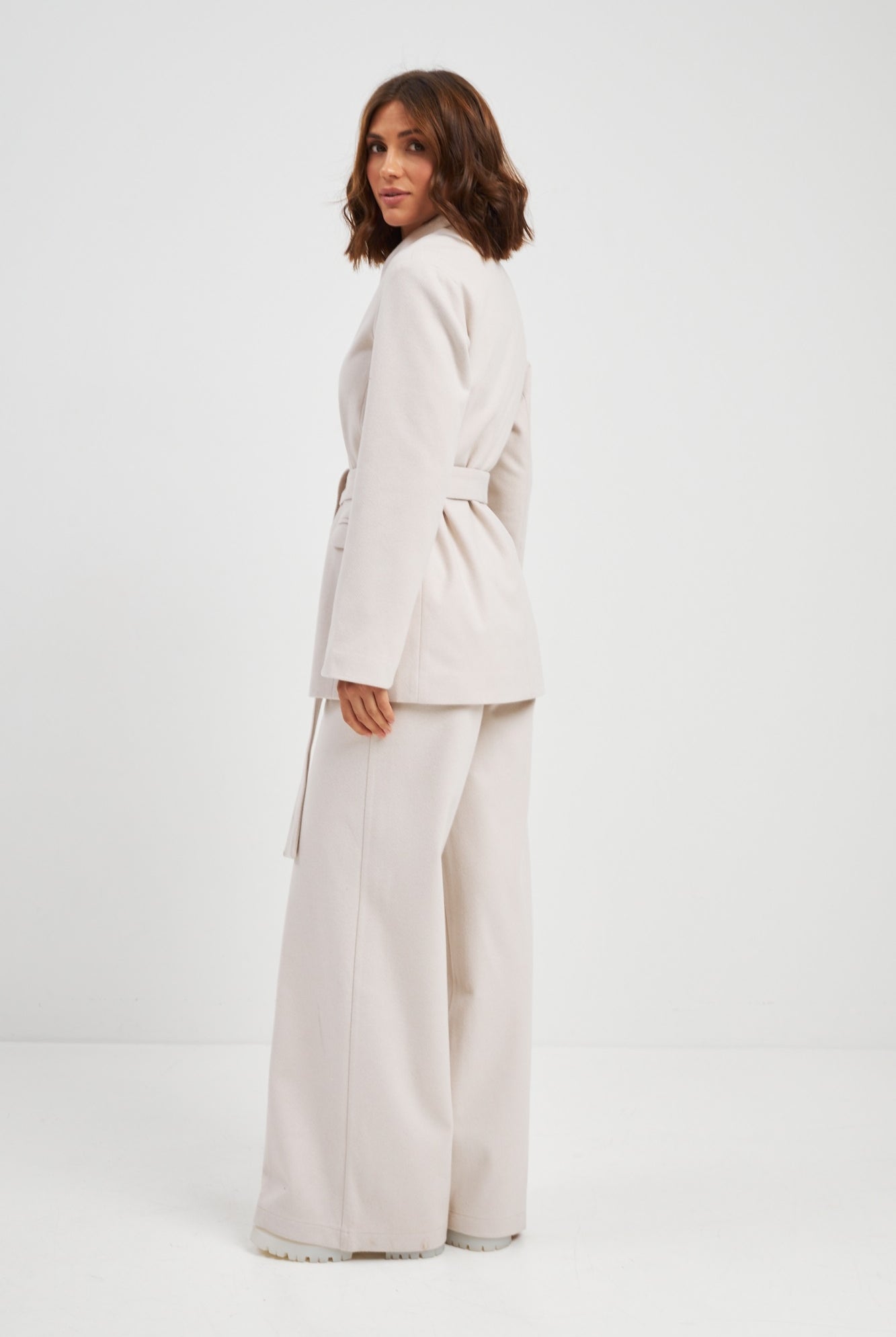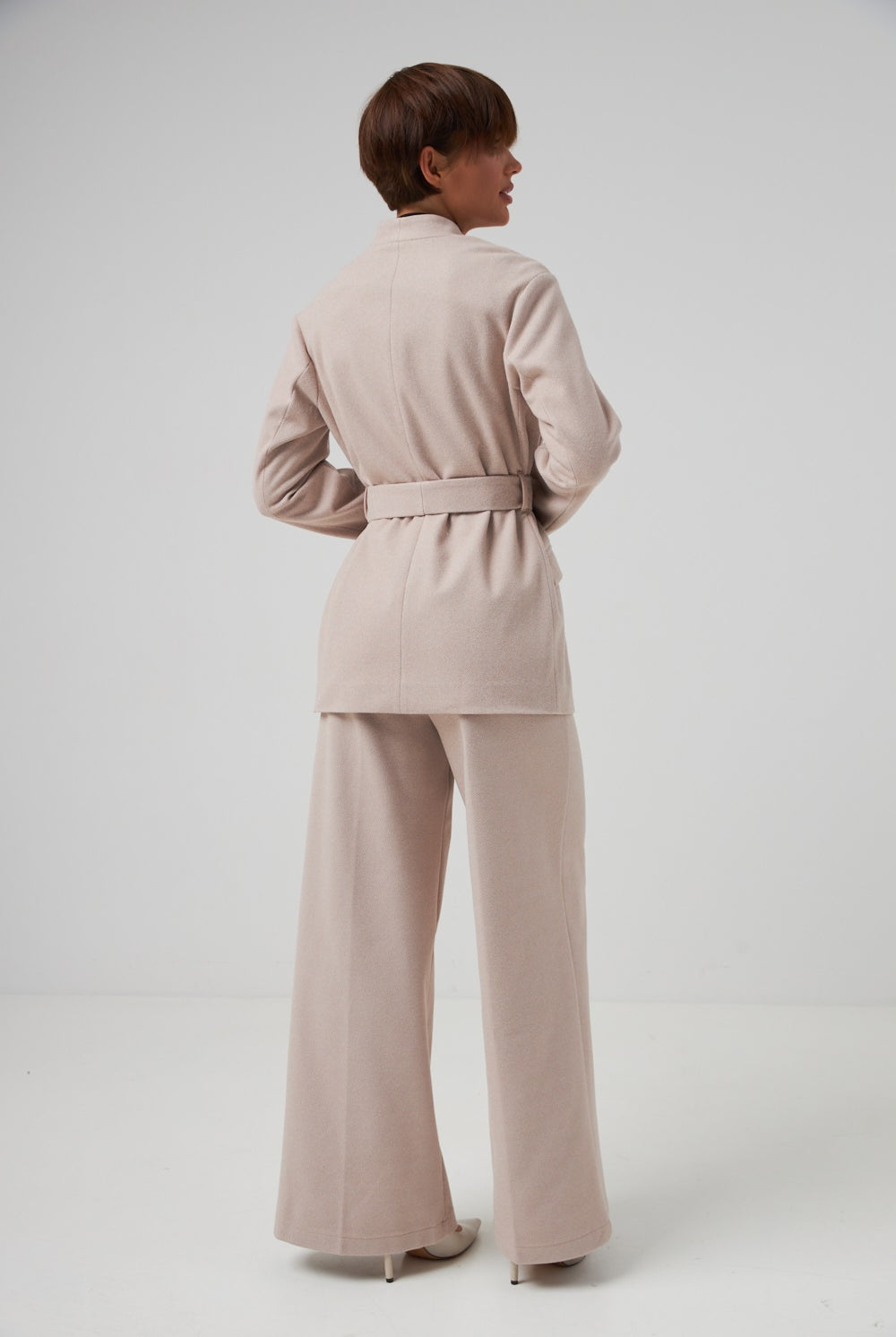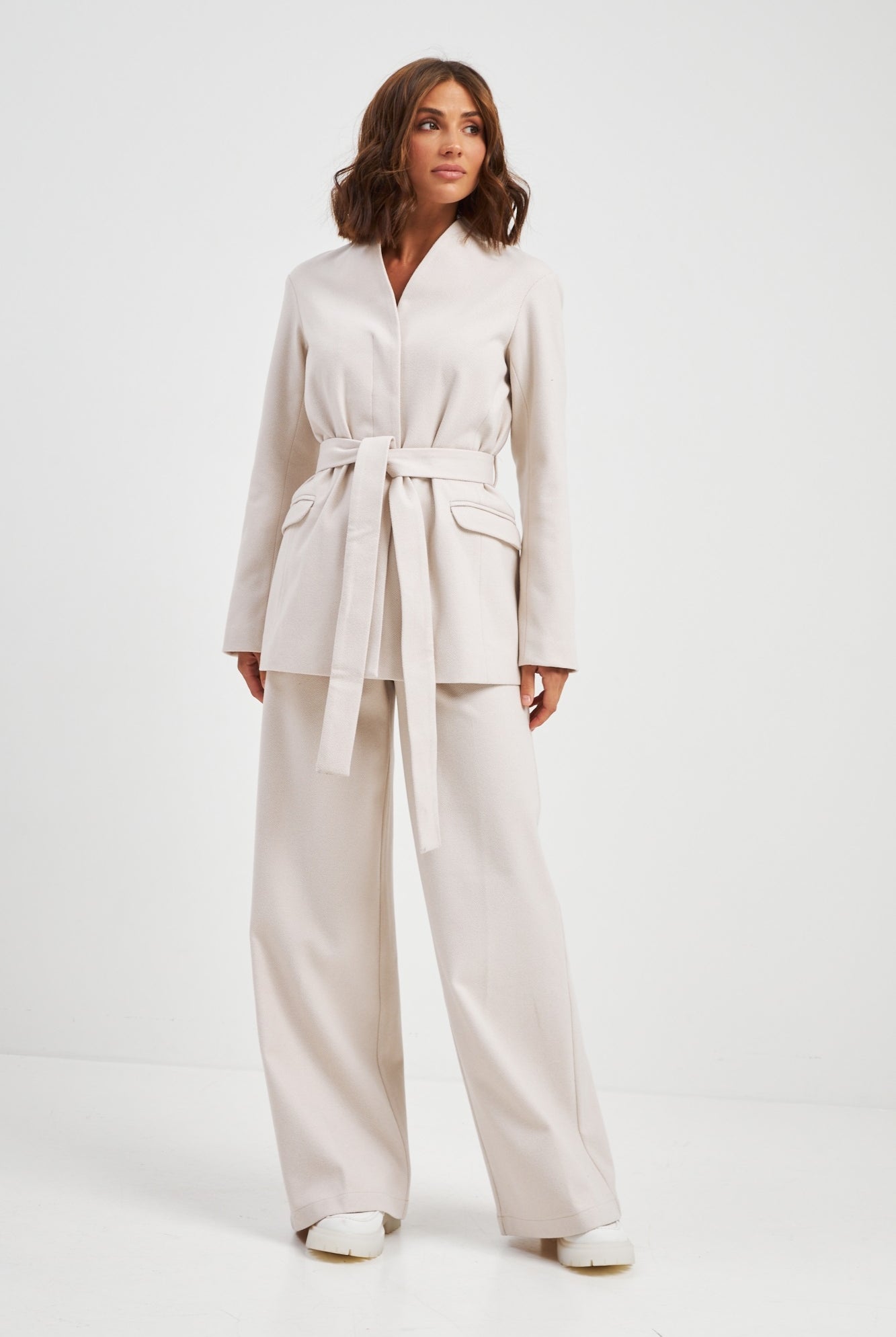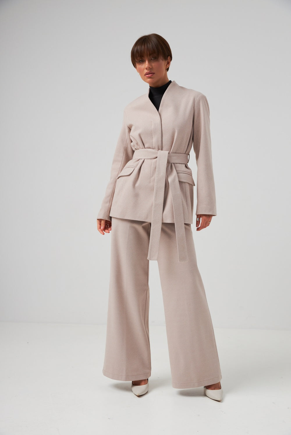 Ми повністю переосмислили форму коміра, зробивши його більш актуальним та структурним. Він тримає форму та додає образу завершеності.